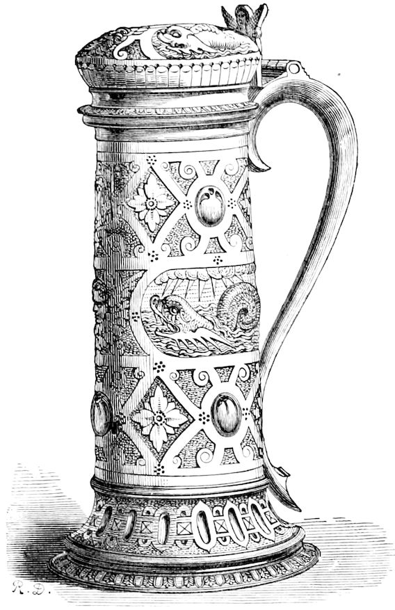 Acratophorum, Gr. and R. (ἀκρατο-φόρος, holding unmixed wine). A table vessel for holding pure wine, while the crater (κρατὴρ), on the other hand, contained wine mixed with water. These vessels were often dedicated to Bacchus. They were made in earthenware and metal, but those that were dedicated to the gods were of gold and silver, and had their place among the treasures of the temples. Fig. 7 represents a silver acratophorum found at Hildesheim.