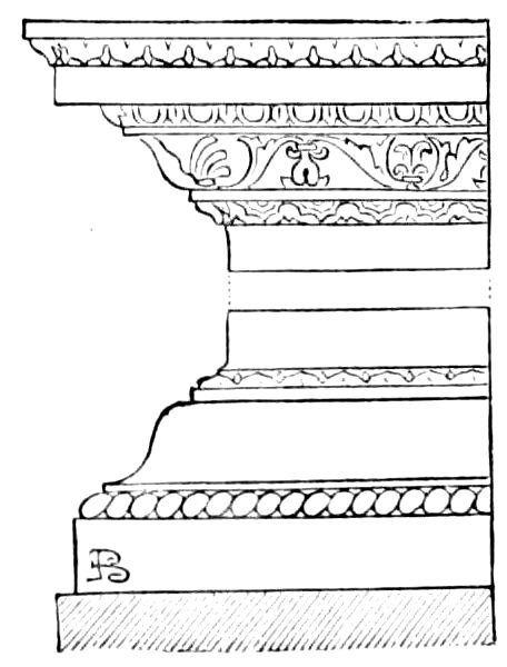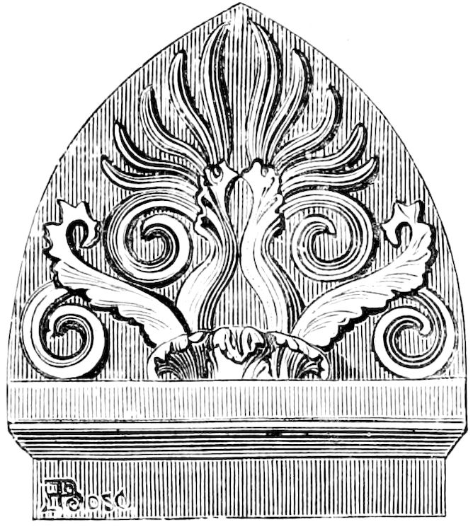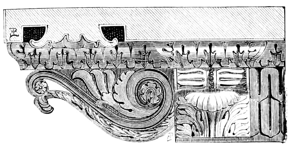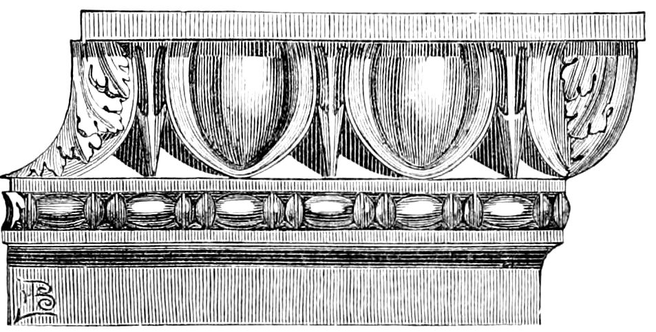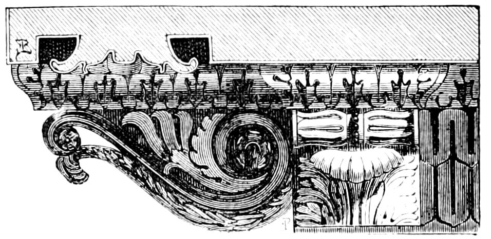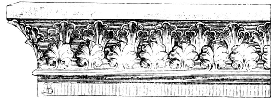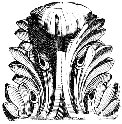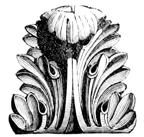 Acanthus, Gr. and R. (ἀκὴ a point, and ἄνθος, a flower). A plant, the ornamental foliage of which has been largely employed as an architectural decoration by different peoples. The acanthus has been applied to the ornamentation of friezes, cornices, modillions, and various other members of architecture, but in especial to the decoration of modillions (projecting brackets) (Fig. 4) and of Corinthian and composite capitals. There are several varieties of the acanthus; those most in use are the cultivated acanthus, or Brankursine (Acanthus mollis), and the spring acanthus (Acanthus spinosa), the foliage of which is much less beautiful, and furnished with small spikes which make the plant resemble a thistle. This last has also often been applied to decoration, in the Romano-Byzantine and lanceolated styles of architecture. An English name for this ornament is the “bear’s claw.”
