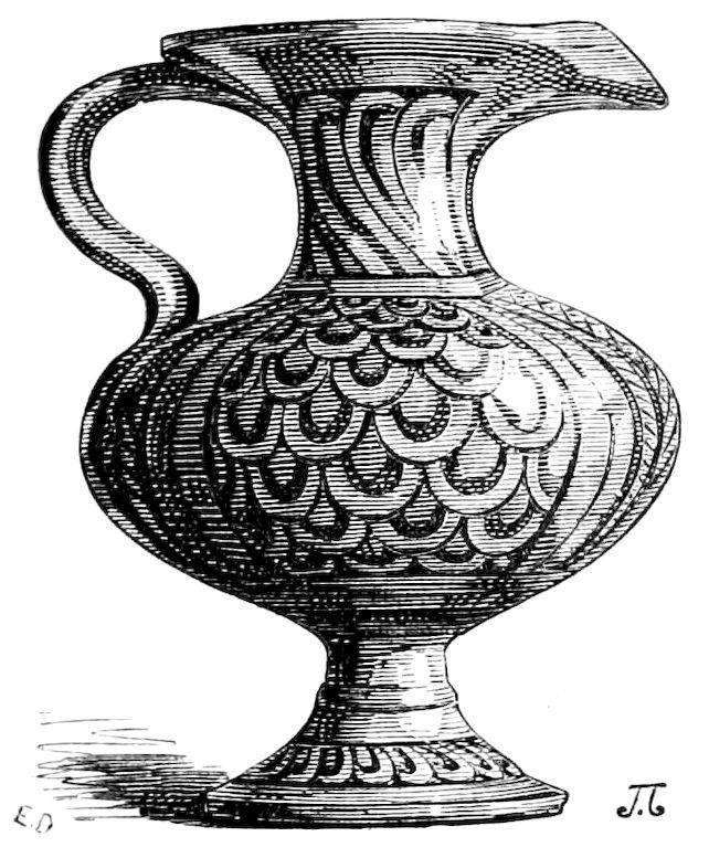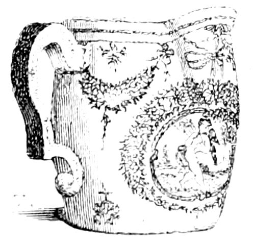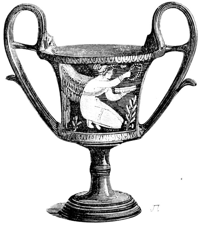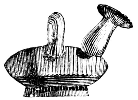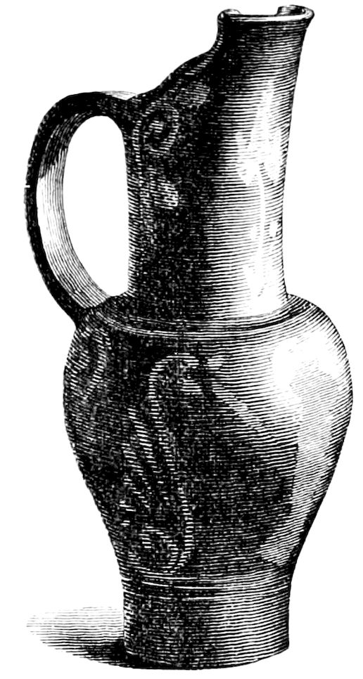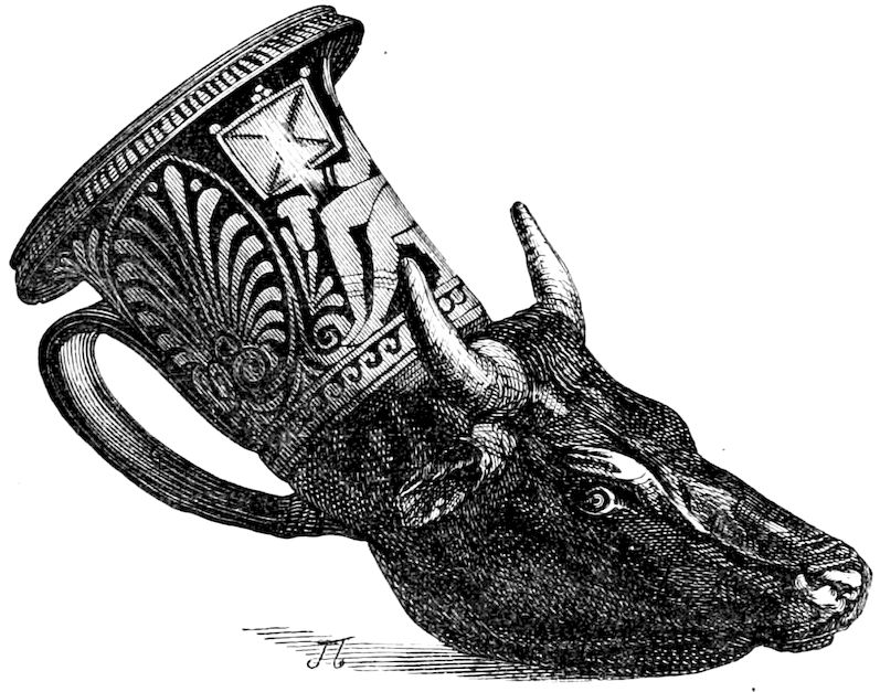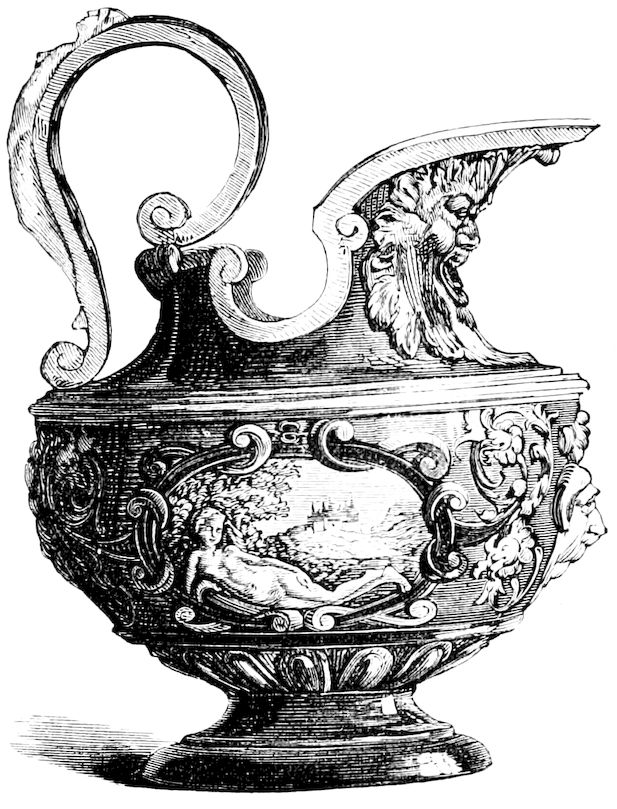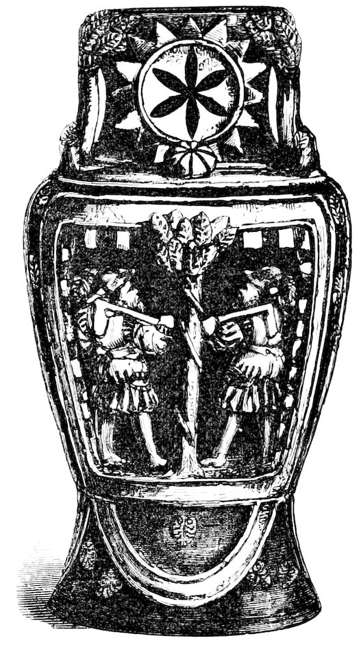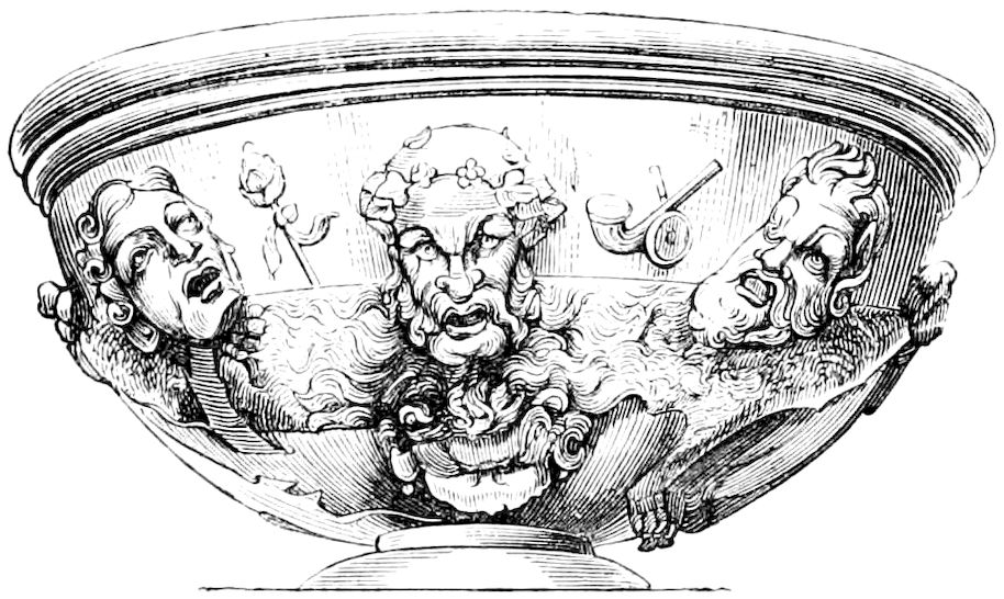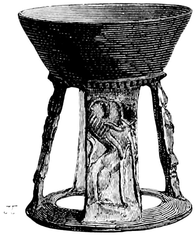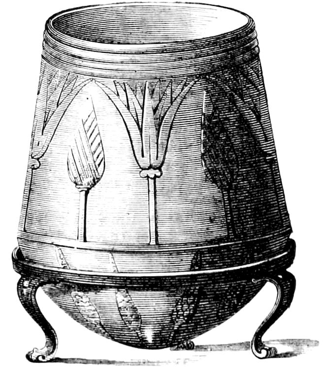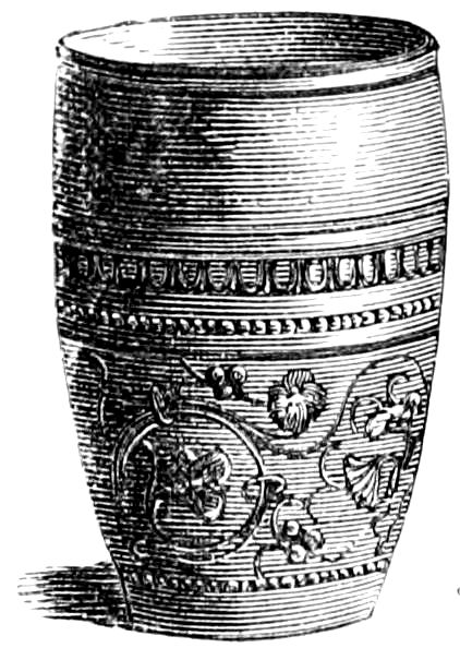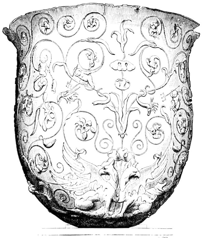 Acratophorum, Gr. and R. (ἀκρατο-φόρος, holding unmixed wine). A table vessel for holding pure wine, while the crater (κρατὴρ), on the other hand, contained wine mixed with water. These vessels were often dedicated to Bacchus. They were made in earthenware and metal, but those that were dedicated to the gods were of gold and silver, and had their place among the treasures of the temples. Fig. 7 represents a silver acratophorum found at Hildesheim.
