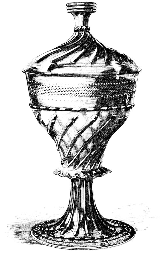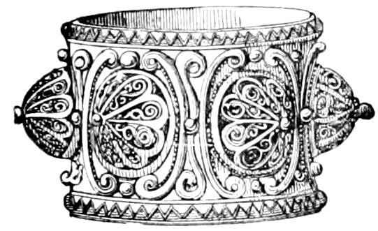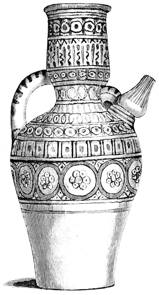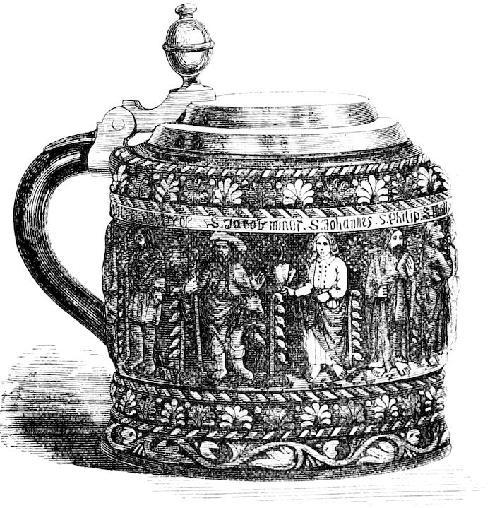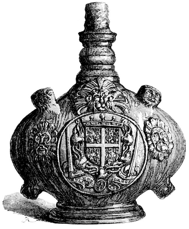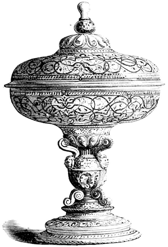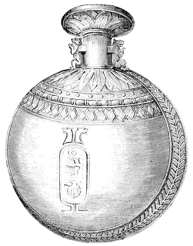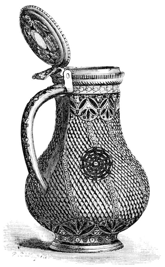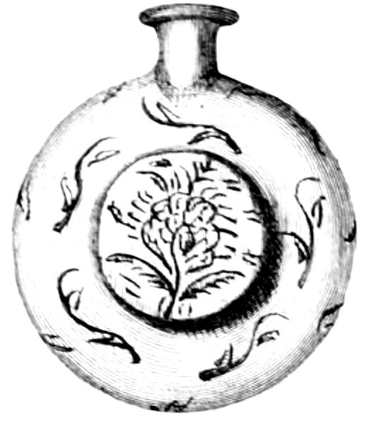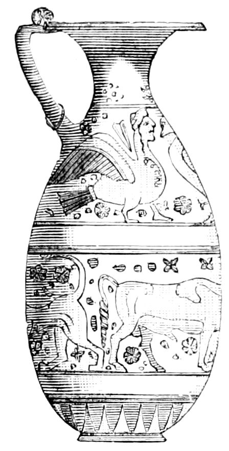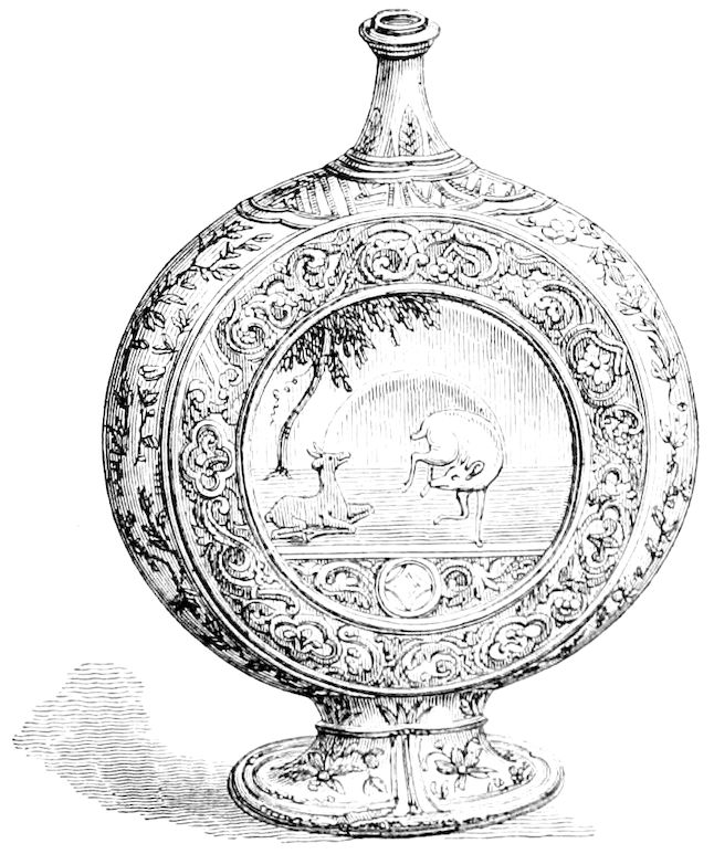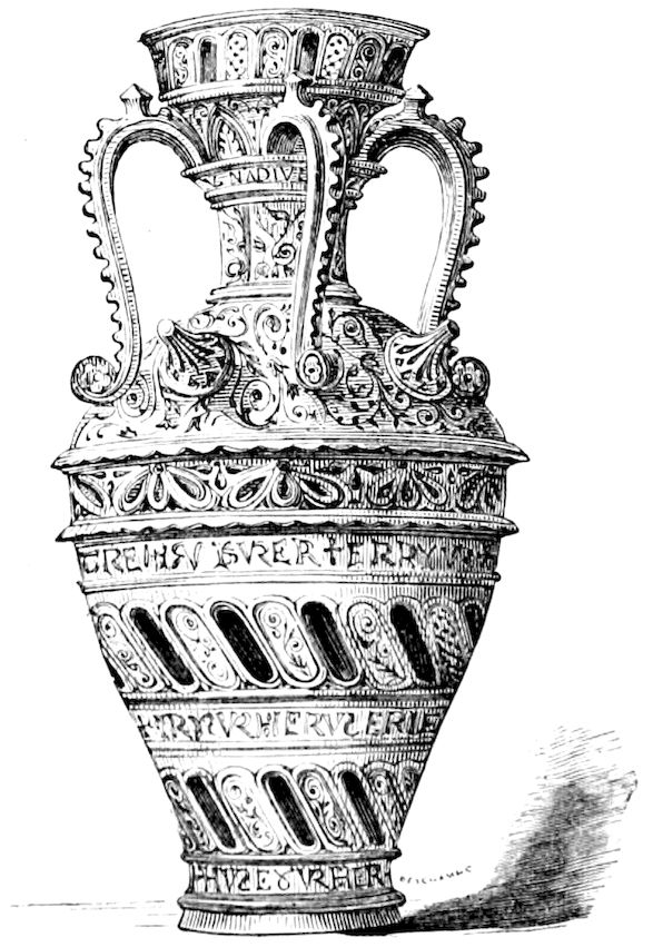 Acratophorum, Gr. and R. (ἀκρατο-φόρος, holding unmixed wine). A table vessel for holding pure wine, while the crater (κρατὴρ), on the other hand, contained wine mixed with water. These vessels were often dedicated to Bacchus. They were made in earthenware and metal, but those that were dedicated to the gods were of gold and silver, and had their place among the treasures of the temples. Fig. 7 represents a silver acratophorum found at Hildesheim.