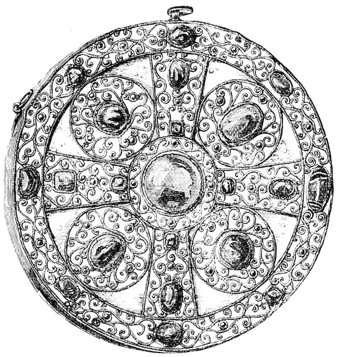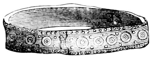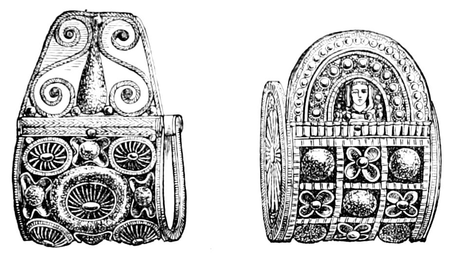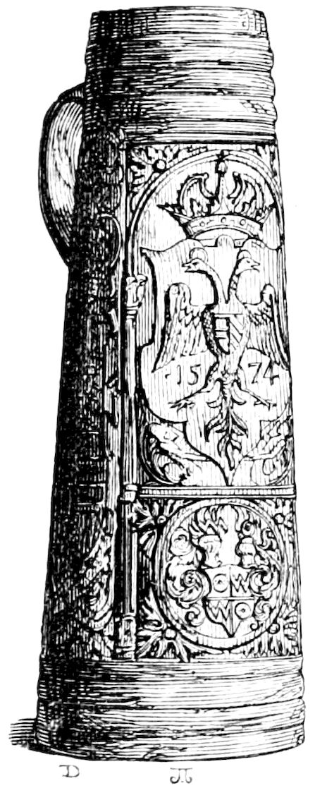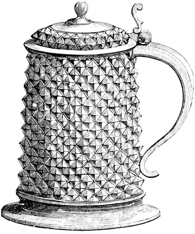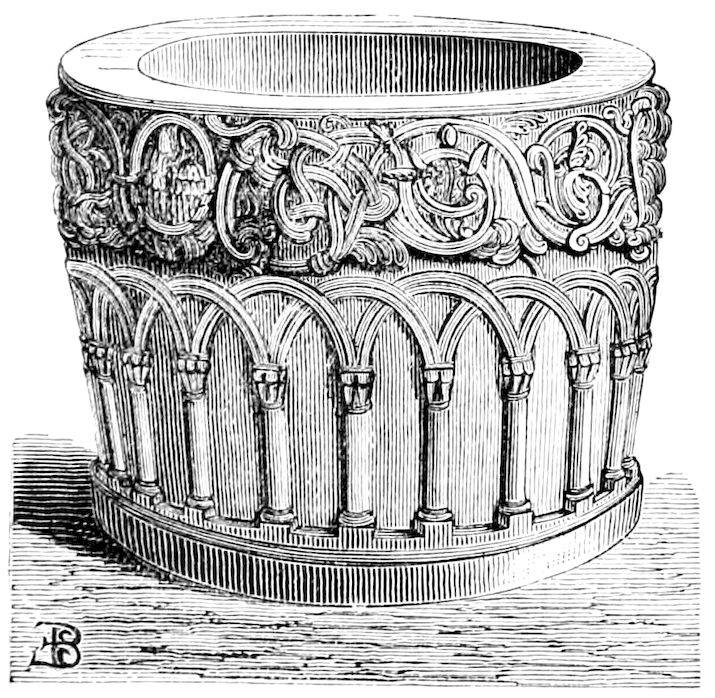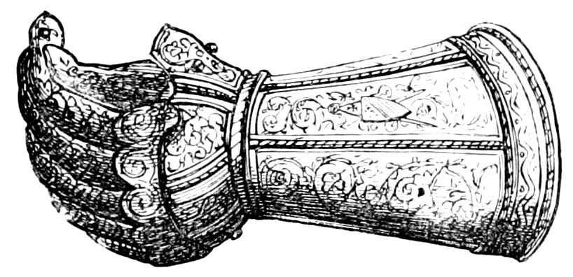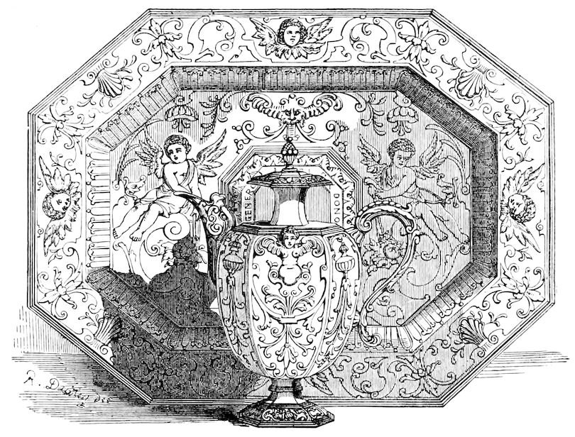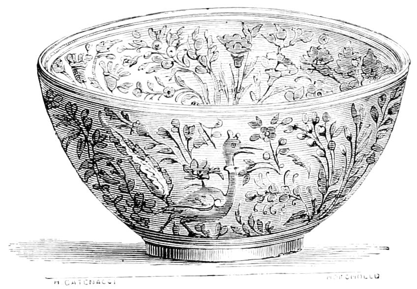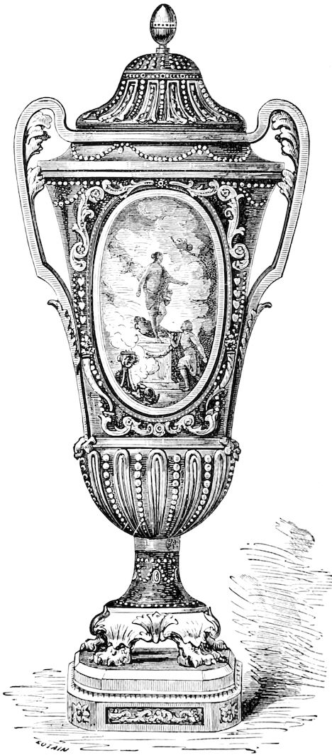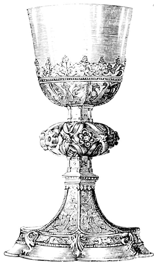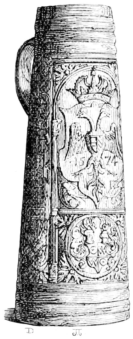 Acratophorum, Gr. and R. (ἀκρατο-φόρος, holding unmixed wine). A table vessel for holding pure wine, while the crater (κρατὴρ), on the other hand, contained wine mixed with water. These vessels were often dedicated to Bacchus. They were made in earthenware and metal, but those that were dedicated to the gods were of gold and silver, and had their place among the treasures of the temples. Fig. 7 represents a silver acratophorum found at Hildesheim.