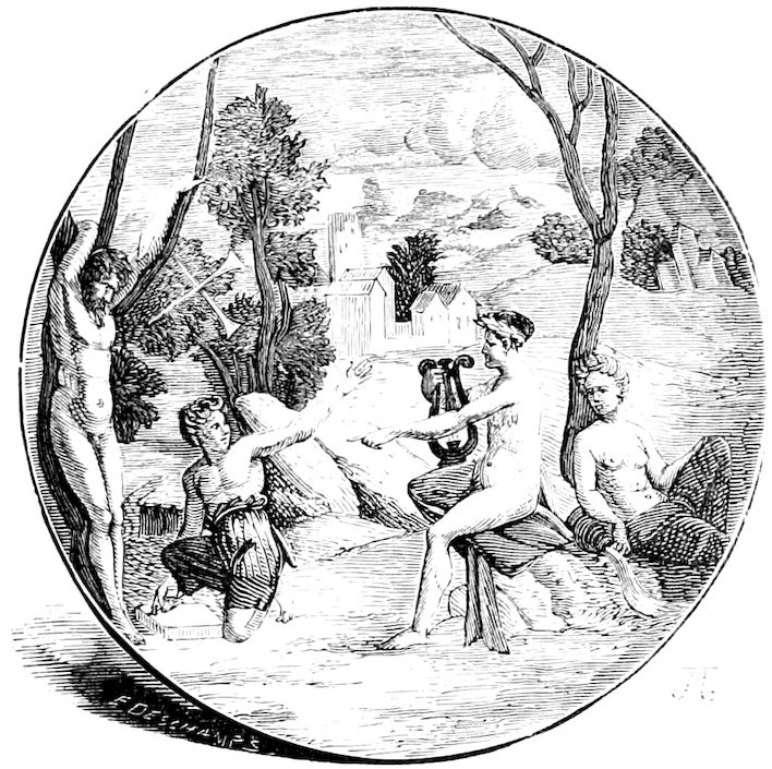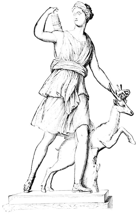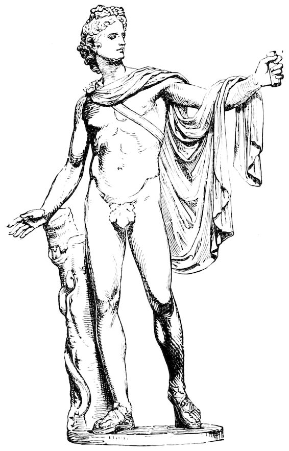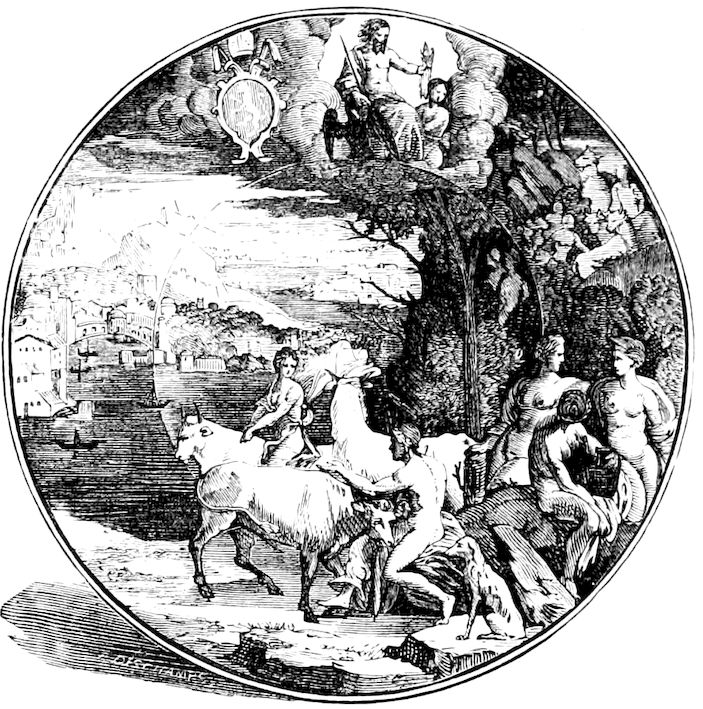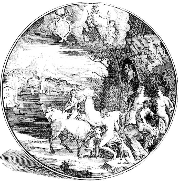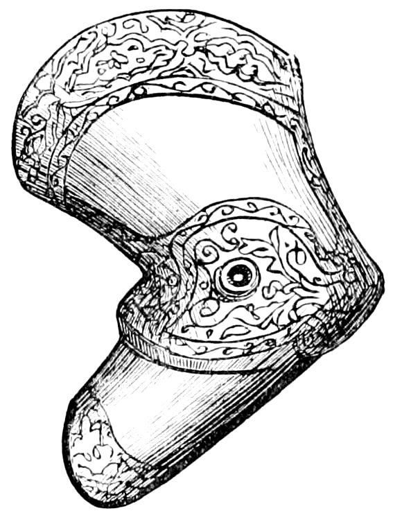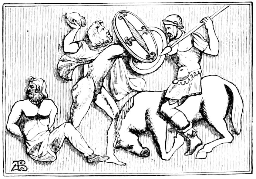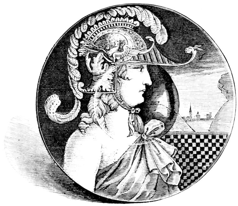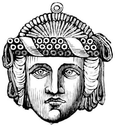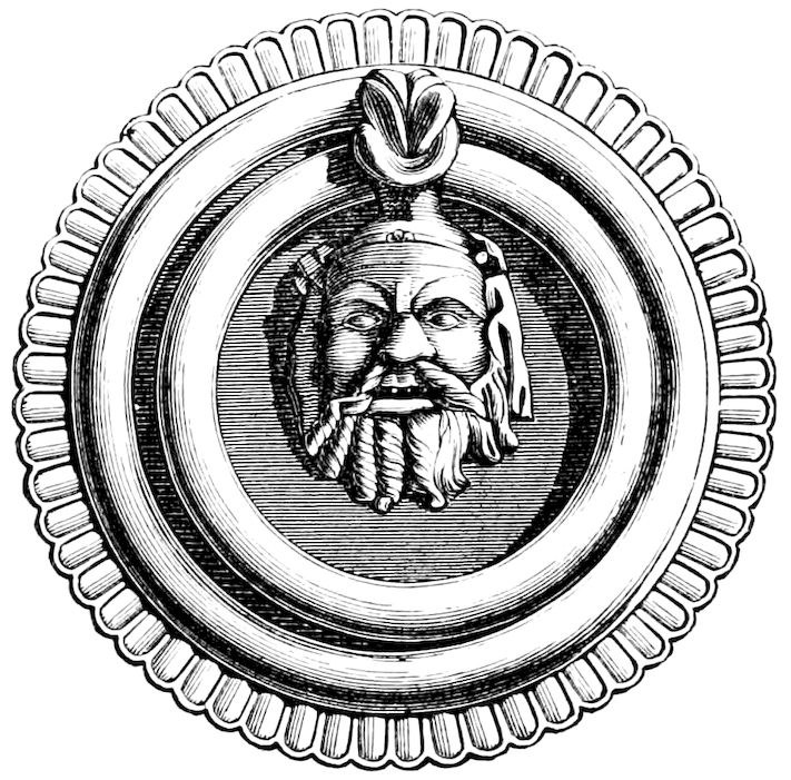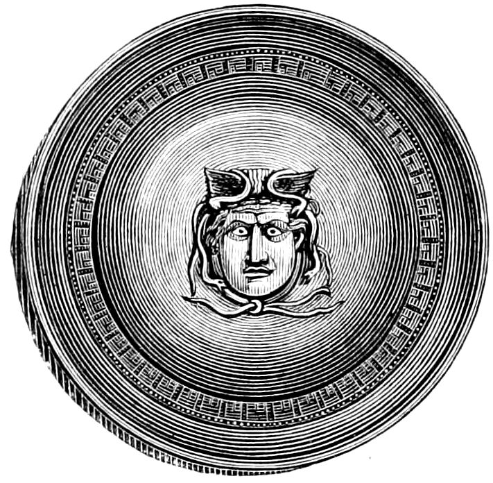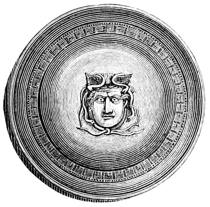 Ægis, Gr. In its primary meaning, a goat-skin. The primitive inhabitants of Greece used the skins of goats and other animals for clothing, and defence. At a later period the Ægis became a protective mantle; the shield of Minerva, beneath which the goddess sheltered those whom she wished to protect from the enemy’s missiles. Later still the Ægis denoted the breastplate of a divinity, in especial that of Jupiter or Minerva, as opposed to the lorica, which was the breastplate of a mere mortal. The ægis bore in its centre the Gorgon’s head, of which the serpents were arranged round the border. Minerva is generally represented wearing it, either as a cuirass or a scarf passed over the right shoulder.