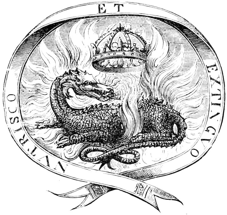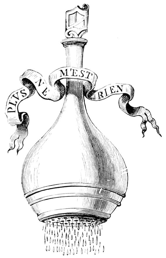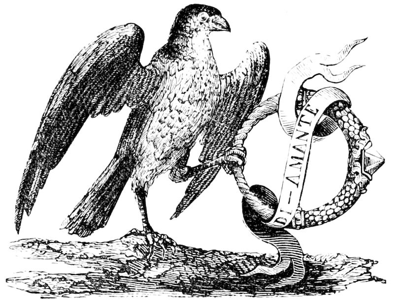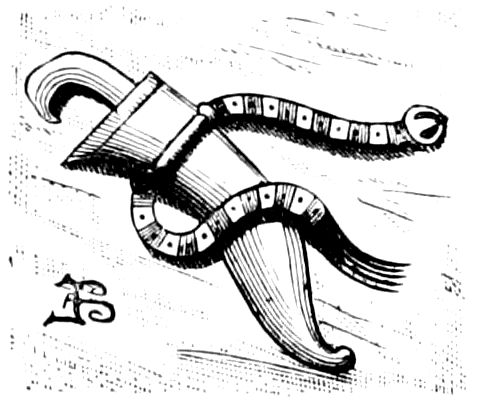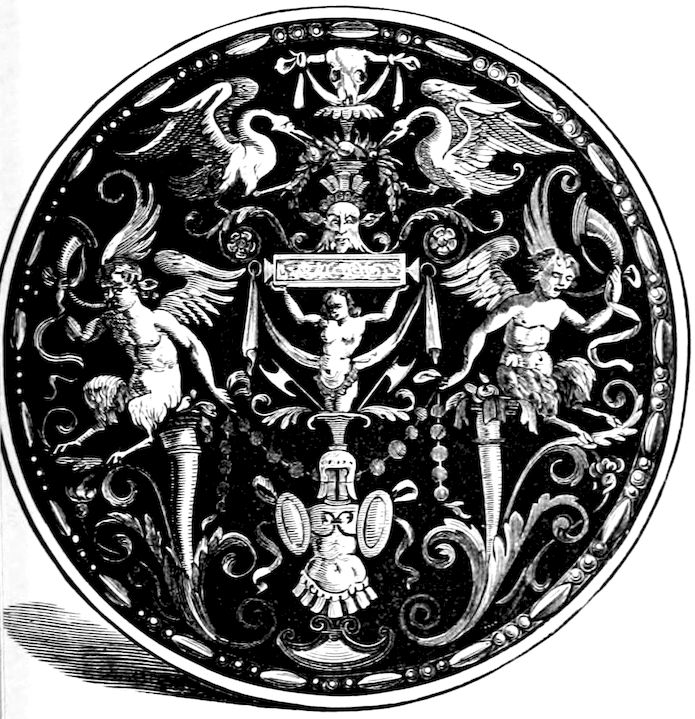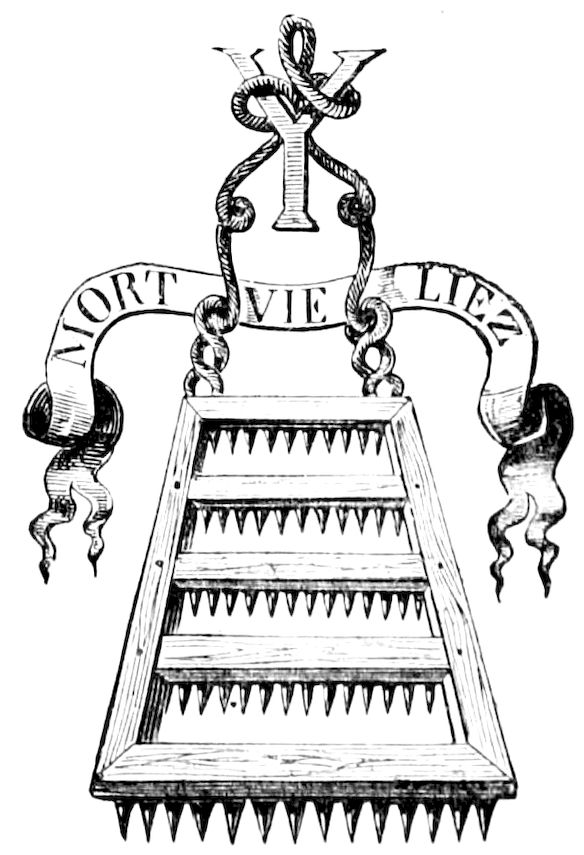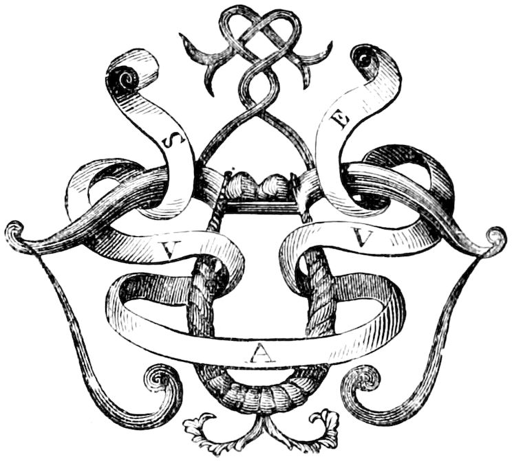 The letter Y is called the letter of Pythagoras because that philosopher made it the symbol of life. The foot of the letter, he said, represented infancy, and as man gradually rises to the age of reason, he finds two paths set before him, the one leading to good, the other to evil, portrayed by two forks of the letter. The illustration is the device of Jean de Morvilliers (+ 1577), Chancellor of France; the harrow tied to the Pythagorean Υ, a rebus on his name Mort-vie-liers—“Death and life united.” The harrow is the symbol of Death, which makes all things equal. (Fig. 701.)