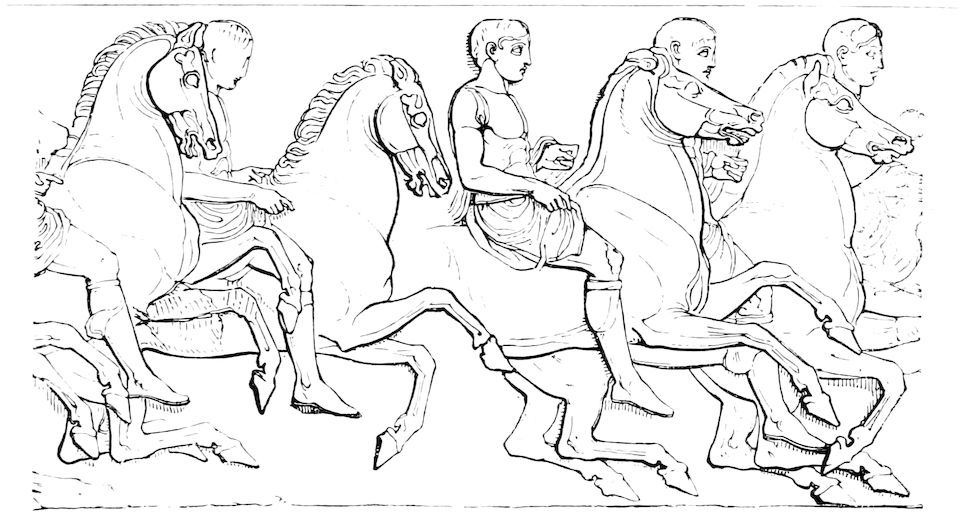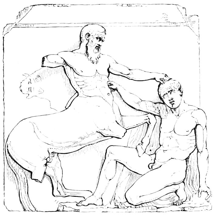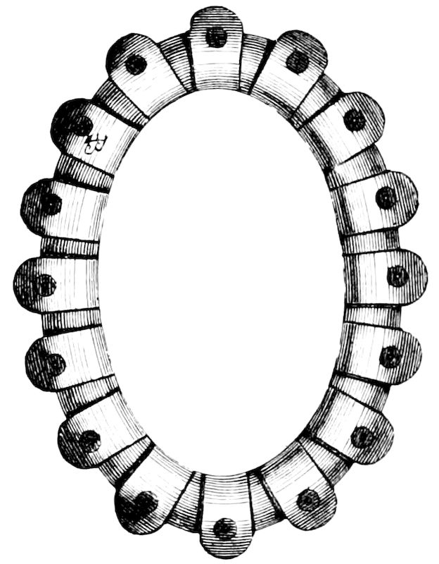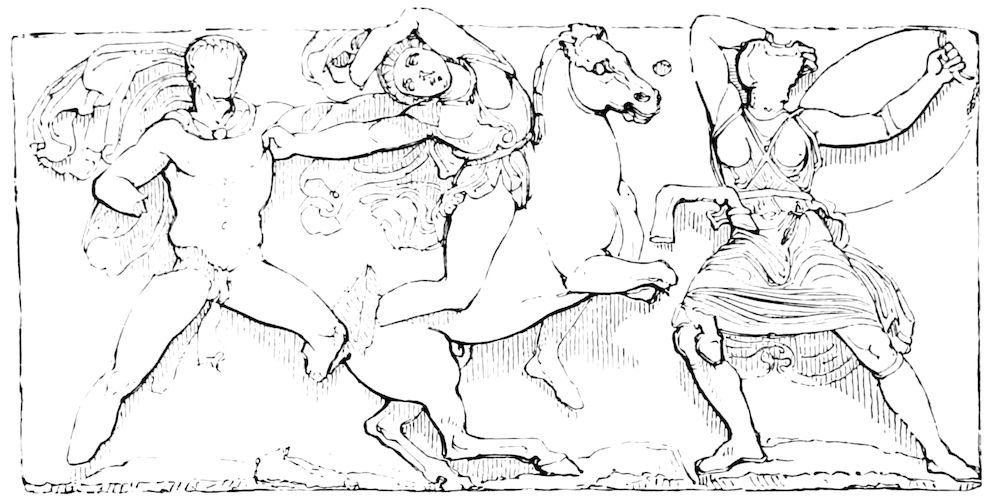 Zona, Gr. (1) A girdle, used to gird up the skirts of the dress for freedom of action (Fig. 157); on occasions of solemnity, as sacrifices or funerals, the girdle was relaxed, and the folds of the dress allowed to hang to the feet (Fig. 537); as a part of the marriage ceremony it was taken off. Upon the armour of men it supported the kilt, and was worn round the cuirass (Fig. 705; cf. Fig. 44). It was generally used as a purse. The celebrated girdle (cestus) of Venus, which conferred beauty and inspired love, is not represented on the statues of that goddess. There is a town on the Ægean Sea called Zona from the belt of trees upon it, still growing in the processional order in which they arrived when they left their native plantations and followed the music of Orpheus. (2) In Architecture, an entablature which encircles any isolated building. Lofty buildings surrounded by seven zones were described as septizonia. (3) In painted vases, horizontal annular bands often decorated with animals. (See Zoophori.)
