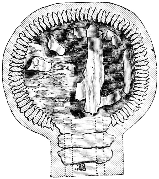 Abraxas, Gr. (a mystical or cabalistic word formed of the Greek letters α, β, ρ, α, ξ, α, ς). Cut stones or gems of very various shapes, upon which are engraved the words Abraxas, Abrasax. They are also known as Basilidian stones or gems, because they constituted the symbols of the gnostic sect of the Basilidians. Certain peoples looked upon them as magic amulets against particular maladies and demoniacal influences. The impressions on these stones are very varied; cabalistic figures, the signs Α and Ω, and the word ΙΑΩ, which designates the Supreme Being. Numerous explanations have been sought for this term abraxas; some philologists assert that it comes from the Persian [or Pehlvi], and that it signifies Mithra; others derive it from the Hebrew, or the Coptic, while others again recognize in it only a numerical sign, the letters of which, added together, would give the number 365, or the number of days that make up the year, and in this case abraxas would symbolize the annual revolution of the sun. A figure often found upon Abraxas stones is that of a serpent with a radiated lion’s head (Chnouphis), which rears itself amid seven stars. The reverse of these stones often bears the inscription ΤΩ ΧΝΟΥΦΙ, “To Chnouphis.”