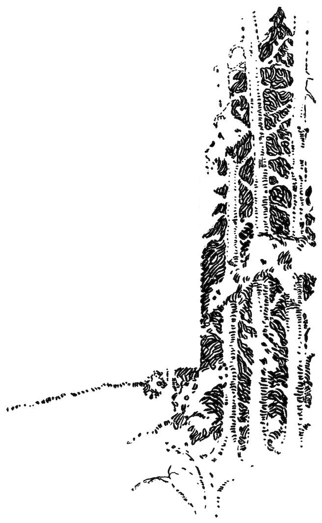 Looking at my watch, I saw that it was nearly dawn. I returned to the tent and laid down as I was under the blankets, and shivered and dozed for half an hour, then I came back to the meadow, where the pack-ponies stood motionless. In the brightening light the moon paled, and I was very soon able to pick out the bull’s trail on the frost-covered ground, where it was almost as plain as if he had been walking in snow. I saw that he had struck up a long valley, from which a pass led into a wooded basin. At the top of the pass I lost the trail entirely, and as it was almost impossible to see for any distance through the woods, I came to the conclusion that the best thing to do was to sit down and await events.