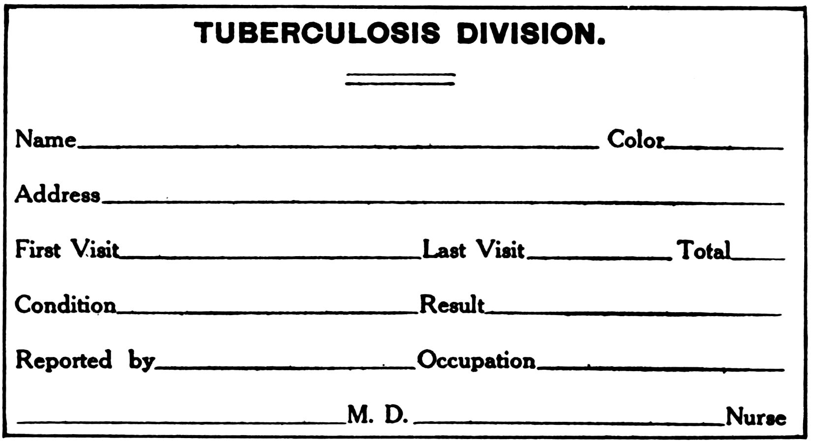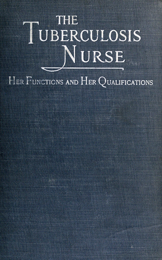 xviIt is also hoped that though the work of tuberculosis nursing is dealt with chiefly as done under the auspices of a Visiting Nurse Association, or as part of the work of a City Health Department, what is here presented will be of value to nurses working under private associations, and to private associations themselves. Therefore, in presenting this book to the public—to nurses, physicians, social workers, anti-tuberculosis associations, and all those engaged in public health work—the writer has two objects in view. First, to offer a working model by which any community can gain some idea as to how to organize and conduct tuberculosis work; second, to offer conclusions, gained through practical experience, as to the nurse’s part in the anti-tuberculosis campaign.