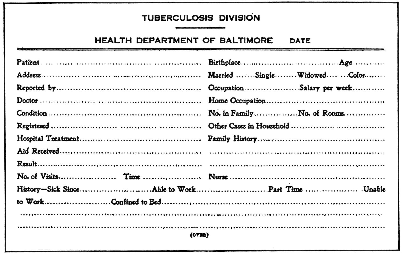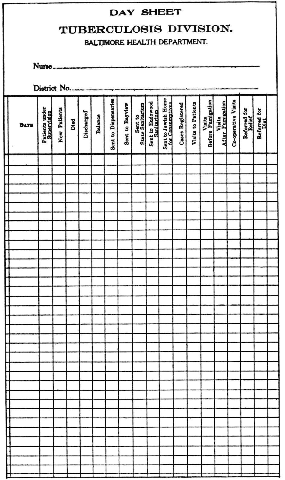 During eight successive years the writer has been engaged in special tuberculosis work, first as field nurse of the Visiting Nurse Association of Baltimore, later as organizer and director of the Tuberculosis Division of the Baltimore Health Department. Entering the field in the pioneer days of 1905, she has seen the work pass through the struggling stages of private enterprise into the well organized, almost automatic grooves of the city machinery. This continuity of service has been an experience of unique value. During this period we have walked into and backed out of many blind alleys or “No Thoroughfares,” and have acquired wisdom through the loss of infinite time, effort, and money. Although the material for the following pages was gathered in Baltimore, and is therefore, strictly speaking, of a local character, yet since practically all of the conditions indicated or dealt with are common to all towns and cities, this need not limit the application of the ideas and principles set forth.