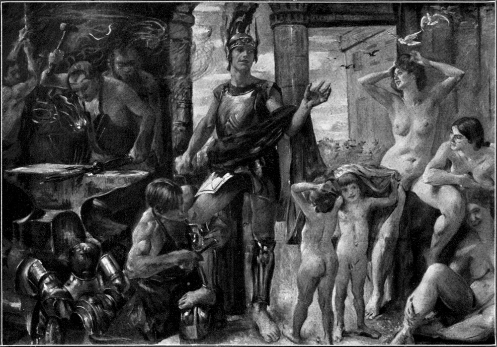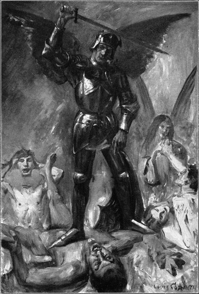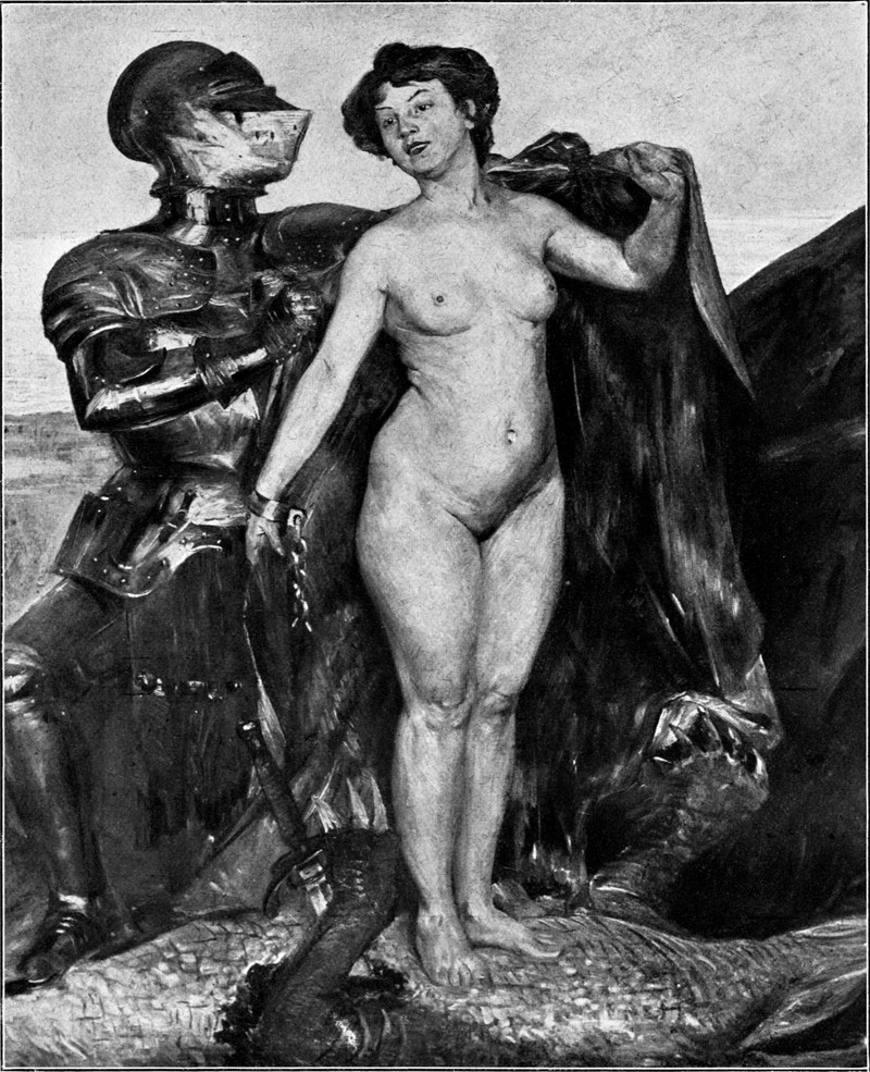 Eine der ersten großen Schöpfungen der Berliner Jahre ist das Gemälde „Perseus und Andromeda“ (Abb. 41). Das Bild ist 1901 gemalt und gibt einen bedeutsamen Auftakt zu späteren Werken aus verwandtem Stoffgebiet. Und doch wird es immer für sich gewertet werden müssen, weil es eines der wenigen Gemälde ist, die wahrhaft monumental ansprechen. Wenn man durchaus kunstgeschichtliche Reminiszenzen hören will, dann kann man sagen, daß es über die Jahrhunderte hinweg unbedingt neben Pisanellos „Heiligem Georg“ in St. Anastasia zu Verona steht, jenem Bilde, auf dem sich das romantische italienische Mittelalter ein unvergleichliches Denkmal gesetzt hat. Mythologie (antik oder christlich bleibt eins) hier wie dort. Die etwas kokette Erscheinung der befreiten Schönen, der in mittelalterlicher Rüstung verkleidete Don Juan der antiken Göttergeschichte, alles ist hier mit modernen Augen gesehen, modern auch mit leuchtendem Kolorismus gemalt und voll der inneren souveränen Größe eines Künstlers, der fortan im Technischen nirgends mehr zaghaft erscheint. Nur wenige kräftige Linien geben der Komposition ihren Raumgehalt; ein taufrischer Humor hat die Szene verklärt.