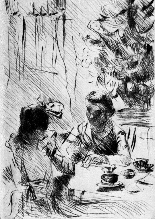 Aus dem gleichen Jahre stammt noch das hier abgebildete Gemälde „Unter dem Kronleuchter“, das in einem köstlichen Farbenmosaik das Flackernde des Kronleuchters, den Glanz von Gläsern und Tellern eingefangen und im ganzen eine Interieurstimmung von äußerst intimem Reiz festgehalten hat (Abb. 68).[S. 85] Ferner muß in diesem Zusammenhang das gleichfalls 1905 unter dem Titel „Mutter und Kind“ gemalte Bild genannt werden, das wiederum ein kleines Stück persönlicher Lebensbeichte bedeutet, da die Dargestellte die Gattin des Meisters und der nackte kleine Kerl auf ihrem Schoße der Erstgeborene des Künstlers, sein Sohn Thomas ist (Abb. 64).