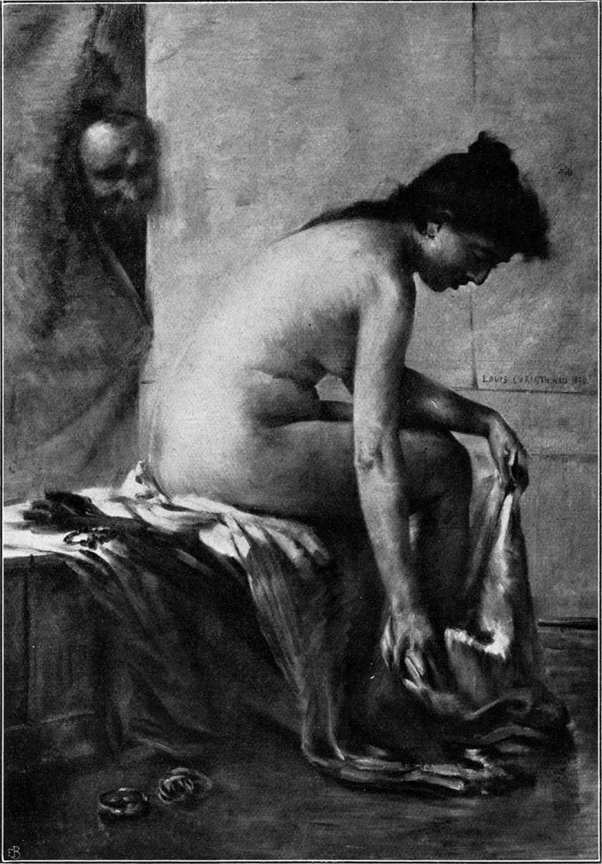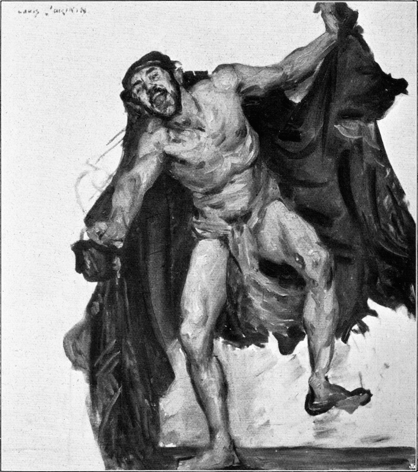 Zwischen dem Weggang von Königsberg und dem in der Selbstbiographie anschließenden Pariser Aufenthalt liegen die Jahre von 1880 bis 1884, die Corinth in München verbrachte, wo er außerdem Gelegenheit hatte, als Soldat sein Jahr abzudienen. Es kann nicht überraschen, daß es den starrnackigen Ostpreußen damals nach der süddeutschen Residenz hinzog, weil der Ruf Münchens als Kunststadt nie höher gewertet worden ist als vielleicht gerade in jenen Jahren. Und mit Recht. Denn hier hat sich in der Tat die Erneuerung der modernen deutschen Kunst vorbereitet. Nicht weil Leibl und Trübner hier wirkten, die[S. 33] damals noch völlig unbekannte Größen waren, sondern weil gerade der akademische Betrieb hier eine — man kann sagen — im übrigen deutschen Kunstschaffen unbekannte Freiheit — eine der Natur zustrebende Art der Betätigung hatte, aus der so viele unserer besten Meister als starke und eigenwillige Individualitäten hervorgegangen sind. Es sei nur an die Verdienste des alten Piloty erinnert, der, selbst noch in traditioneller Kunstanschauung völlig befangen, als Lehrer[S. 34] den Jungen jene prachtvolle Dosis Selbstbewußtsein, ja jene neuen Lehren vermittelt hat, die unmittelbar dem Aufschwung der deutschen Malerei vorgearbeitet haben. Desgleichen an Wilhelm von Diez und Ludwig Löfftz, in dessen Schule Corinth — wie so viele seiner damaligen Kollegen — eintrat. Aus dieser Münchener Zeit sind uns ebenfalls nur sehr spärliche Proben seines Könnens erhalten, so der Akt, der einen der Schächer einer Kreuzigungsgruppe darstellen soll und zweifellos nach einem Thema, das der Lehrer gestellt hat, gemalt ist. Sehr bedeutsam treten bei diesem im Besitz von Gerhart Hauptmann befindlichen Bild der[S. 35] Sinn für die Plastik des menschlichen Körpers und doch auch ein gewisses selbstsicheres Können hervor, wenn die Arbeit sonst auch noch keinen Blick in die Zukunft gestattet (Abb. 3). Im ganzen aber ist Corinth auch in dieser Zeit noch wenig produktiv gewesen, wie es überhaupt als besondere Eigenart[S. 36] seines sich entwickelnden Talentes — sogar noch im Verlaufe der nächsten zehn Jahre — betont werden muß, daß er überall lieber in sich aufgenommen als künstlerisch produziert hat. Vielleicht sind von keinem Maler der Moderne so wenige Frühwerke festzustellen und nachzuweisen wie von unserem Meister, und sicher ist es auch kein schlechtes Zeichen seiner erwachenden Könnerschaft, daß er gerade in seiner Jugend mit seinen Kräften so sorgsam hausgehalten hat. Viel mag zu dieser Sparsamkeit der Betätigung auch ein gewisses mangelndes Selbstvertrauen beigetragen haben, das nur der etwas schwerfälligen Art des Ostpreußen[S. 37] entsprach, ja es scheint psychologisch durchaus begründet, daß Corinth eigentlich erst auf dem Boden Berlins, in dieser von echter Kampfesstimmung gehöhten Atmosphäre, später ganz aus sich herausging, als ihn das Beispiel der Kollegen und die bittere Notwendigkeit des Tages dazu zwangen. Einmal frei geworden aber in dieser neuen Umgebung, hat er versucht, alle Versäumnisse der früheren Jahre doppelt wett zu machen und der Fülle der Gesichte, dem sprudelnden Reichtum seiner Phantasie wirklich freie Bahn zu schaffen. Die akademische Lehrzeit in München dagegen verschwindet in ein Nichts, empfände man nicht un[S. 38]bewußt, daß der Einfluß von Löfftz auch für ihn sein Gutes gehabt hat und daß gerade er ihn vorbereitend schon auf jene Themen hingelenkt hat, in denen er später wirklich ein Meister werden sollte.