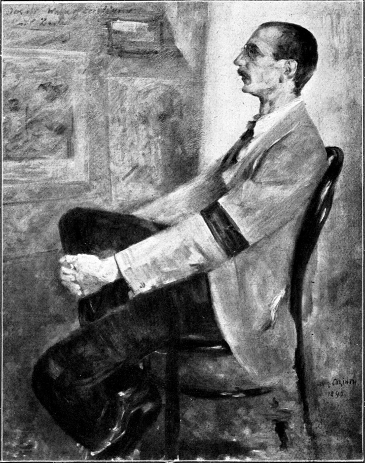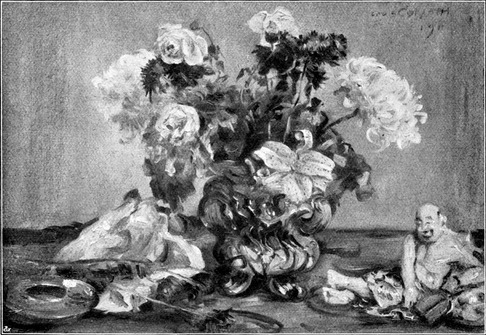 In den bereits mehrfach zitierten „Legenden aus dem Künstlerleben“ finden sich einige Kapitel, die Corinth in Erinnerung an seinen zehnjährigen Münchener Aufenthalt geschrieben hat. Schilderungen sarkastischer Art, in denen er z. B.[S. 50] den im Allotria-Kreise üblichen Götzendienst und Firlefanz wunderbar verspottet; Skizzen von einer derben Ursprünglichkeit, die niemand ungelesen lassen sollte, den die Persönlichkeit unseres Meisters wirklich interessiert. Prächtig z. B. — und vielleicht von keinem Literaten übertroffen — ist der Abschnitt über „Thomas Theodor Heine und Münchens Künstlerleben am Ende des vorigen Jahrhunderts“, und bitter verdacht haben ihm seine Kollegen jenes andere Kapitel, in dem die Erinnerungen an den Allotria-Kreis aufgezeichnet sind. Die haben sogar zu einer kleinen Polemik geführt, aus der Corinth ganz zweifellos als Sieger hervorgegangen ist, nicht nur weil er dank seiner haarscharfen Dialektik die Lacher auf seiner Seite hatte, sondern weil man deutlich empfand, wie peinlich auch den herrschenden Herren in der Münchener Künstlerrepublik diese der Wirklichkeit abgelauschten Schilderungen sein mußten.