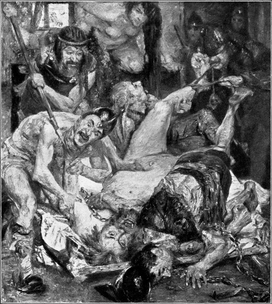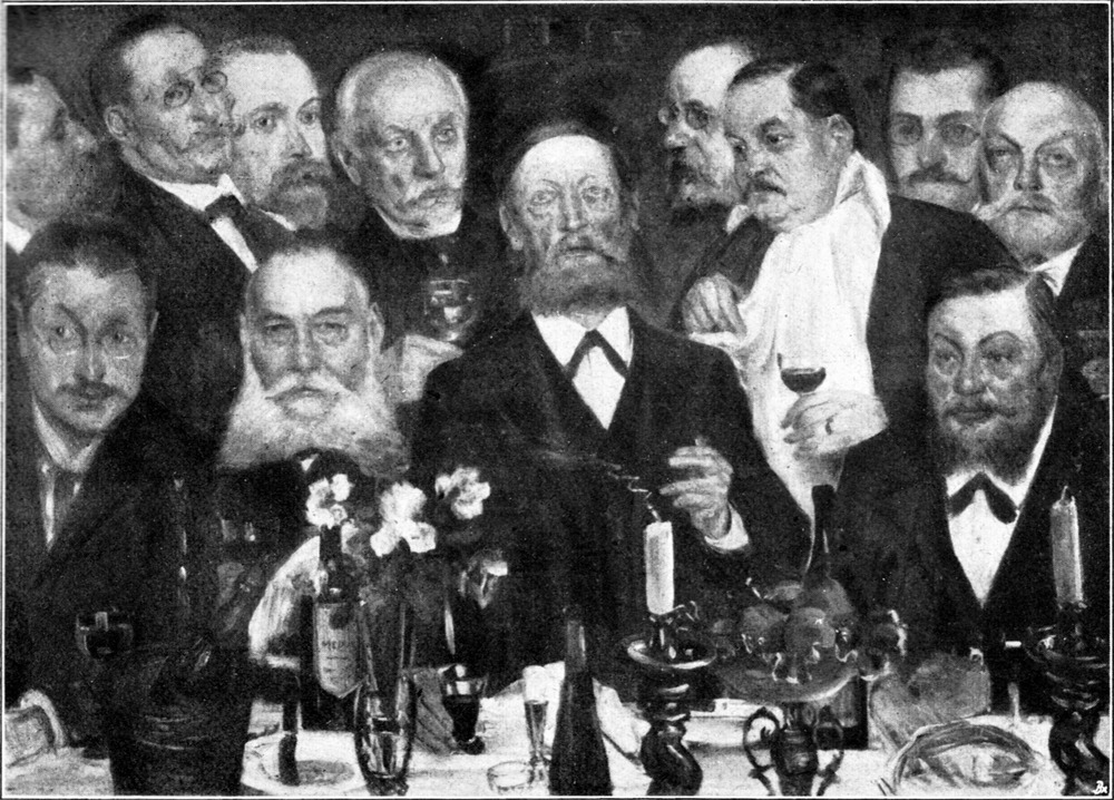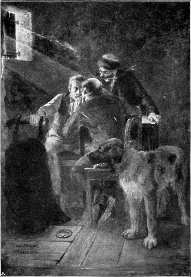 Sicher ist dieser fast dreijährige Pariser Aufenthalt für den Werdegang des Meisters von nachhaltigem Einfluß gewesen. Er hat viel und fleißig gearbeitet, und während das Leben der Großstadt seinen geistigen Horizont nicht unbeträchtlich erweiterte, gelang es ihm in Paris auch, die erste öffentliche Anerkennung in Form einer „mention honorable“ zu erringen, die seinem „Komplott“ vom[S. 45] Jahre 1884 im Salon des nächstfolgenden Jahres zuteil wurde. Auch über diesen Erfolg hat uns Corinth berichtet: von den endlosen Tagen ängstlicher Erwartung, ob seinem Bilde ein „admis“ von seiten der Jury zuteil werden würde, von der tiefen Erregung, als endlich die sehnsüchtig erwartete Nachricht eintraf, von dem Irren und Suchen in den Sälen, in denen die tausend und mehr Bilder oft wie Briefmarken bis oben an die Decke hinaufhingen, und dem Moment, wo er endlich seine Arbeit hoch oben über einem Riesenschinken fast völlig unsichtbar wiederfand. Das war eine schlimme Ernüchterung für den jungen Künstler, der nach der Annahme seines Bildes so stolz gewesen war. Das Bild selbst ist noch vor dem Einzug ins Atelier Bouguereaus in München entstanden; es ist[S. 46] in gleicher Weise typisch für den damals aufkommenden Drang nach realistischer Vertiefung und die von der Mode bevorzugte Genremalerei. Aber es hat Qualitäten künstlerischer Art, die es bedeutsam aus dem übrigen Schaffen dieser Jahre herausheben (Abb. 7). Nicht nur weil die Gruppe der Verschwörer ungemein lebenswahr gesehen ist, sondern weil hier auch der erfolgreiche Versuch gemacht ist, das Licht als eigentlichen Lebensfaktor des Gemäldes zu verwenden. Prachtvoll gelungen ist besonders der Bernhardiner im Vordergrunde.
