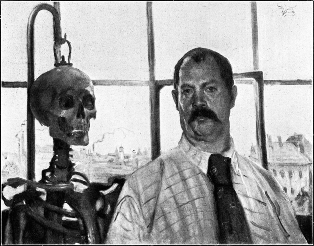 Eine der bedeutendsten Schöpfungen dieser Münchener Epoche ist das Dichterbildnis des Grafen Keyserlingk, das Corinth im Jahre 1896 gemalt hat (Abb. 30). Einfach bis zur Primitivität, legt es den künstlerischen Nachdruck ganz und gar auf die physiognomische Durchbildung des Antlitzes. Seltsam beängstigend wirkt der starre Blick des Poeten, die mehr als Geist, denn als Körper empfundene Gestalt dieses später erblindeten Dichters, den unsere Literatur mit zu den besten zählt. Wollte man ein von ähnlicher Durchdringung des Charakters erfülltes[S. 56] Bild namhaft machen, man käme wie von selbst zu jenem köstlichen Selbstporträt des Meisters aus dem gleichen Jahre (Abb. 35). Durch das Atelierfenster irrt der Blick zu den Häusern von Schwabing hin und das Totengerippe neben dem Künstler mag an die Vergänglichkeit alles Irdischen mahnen. Ernst und grübelnd sieht der Künstler den Beschauer an, und man empfindet vor diesem willensstarken Menschen deutlich, daß nachdenkliche Stunden seinem Leben den wahren Reichtum zugeführt haben. Vielleicht, daß man eines Tages gerade dieses Selbstbildnis in eine Reihe mit den berühmten Porträts der Kunstgeschichte stellen wird, obwohl sich der Meister in den nachfolgenden Jahren wie Rembrandt gern und oft in wechselnder Erscheinung porträtiert hat. Diese Selbstbildnisse haben neben dem rein künstlerischen auch ein biographisches Interesse. Sie sind Belege für Seelenstimmungen und stellen nie den ganzen Menschen dar, aber alle zusammen spiegeln sie doch die Vielseitigkeit eines Geistes, der in seinem Verlangen nach künstlerischer Universalität nicht zu unterschätzen ist. Hier erscheint Corinth in Reflexionen befangen, dort mit offenen Armen der frohen Lebenslust zugewandt. Hier ein Draufgänger in mittelalterlicher Rüstung, so wie er sich später auf dem berühmten „Fahnenträger“ darstellt, dort ganz erfüllt von der Freude an Heim und Familie. Immer aber überkommt den Betrachter die Empfindung, daß neben den rein malerischen Aufgaben es in erster Linie psychologische Probleme gewesen sind,[S. 57] deren er mit Hilfe der Farbe Herr zu werden bemüht war. Wie schon gesagt wurde, erinnert diese Folge der Selbstporträts an den großen holländischen Meister, dessen Menschenschicksal nirgends so unmittelbar vor unser Bewußtsein tritt wie auf den jubilierenden Bildnissen der glücklichen Saskiazeit und im Gegensatz dazu erschütternd auf jenen Selbstporträts seiner Spätzeit, die ganz Weltabkehr und Resignation geworden sind. Psychologisch verwandte Momente zeigen auch die Corinthschen Schöpfungen dieser Art, allen voran das eben erwähnte Selbstbildnis mit dem Skelett.