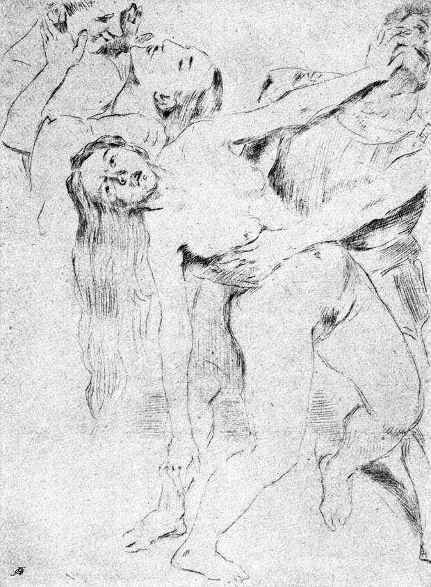 Unter den zahlreichen Werken des folgenden Jahres steht die heute im Leipziger Museum befindliche „Kreuzabnahme“ obenan (Abb. 74). Ja, man kann sagen, wenn der Satz, daß die reine Kunst überhaupt mit dem Motiv nichts zu[S. 86] schaffen habe, vor einem einzigen Bilde zu erhärten wäre, man hier die Probe aufs Exempel machen könnte. Denn hier ist alles groß gesehen, die malerische Komposition, die in der Mitte durch den Kreuzesstamm ihre Achse erhält, die Art, wie die Gruppe vor den Abendhimmel gestellt ist, wodurch dem Licht wiederum die Rolle des eigentlichen Lebensfaktors zuerteilt wurde, das Gedankenvolle auf den einzelnen Gesichtern der Menschen und die Verschiedenartigkeit ihrer Temperamente, der Gegensatz zwischen dem von hinten gesehenen, derb und teilnahmlos dreinschauenden Kriegsknecht und der schmerzerfüllten Frauengruppe der rechten Hälfte. Nichts ist auf diesem Bilde übertrieben, das Großartigste an malerisch zeichnerischem Können bedeutet aber doch der vom Kreuze herabgeholte Heiland, dessen müdes Dahinsinken ganz meisterhaft gesehen ist. Das Leipziger Museum darf sich zu diesem von einem Kunstfreunde gestifteten Werke aufrichtig beglückwünschen.