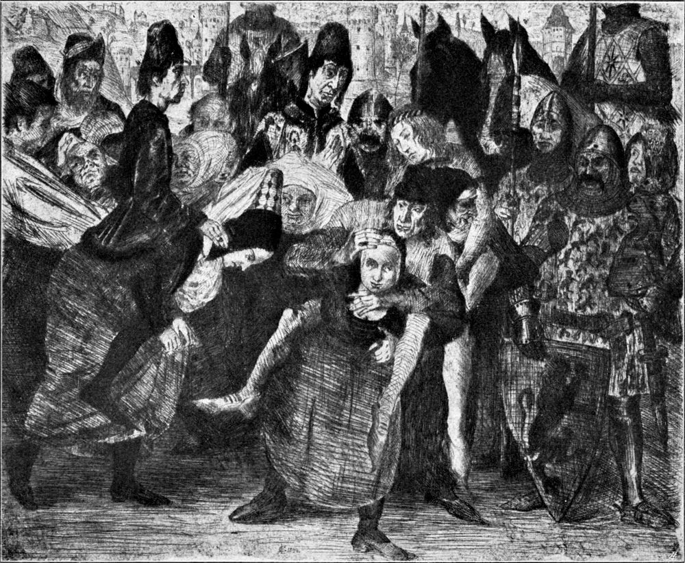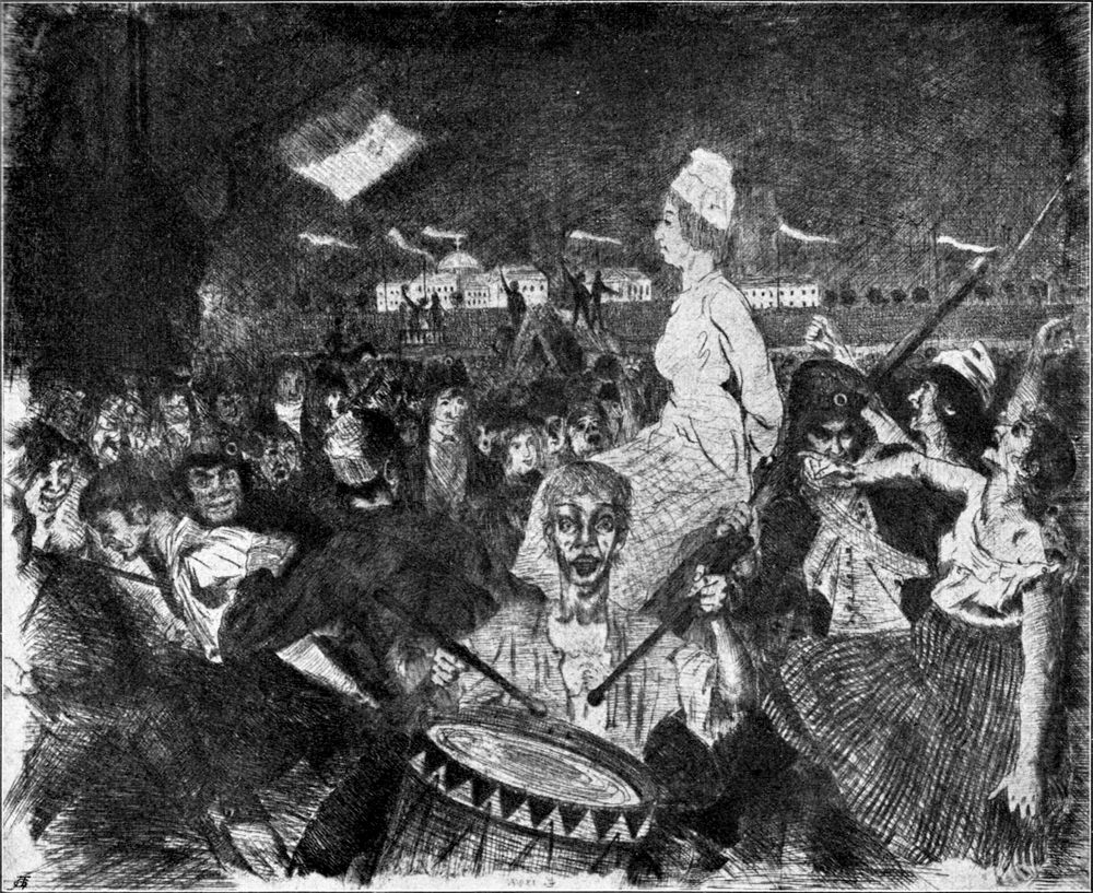Denn in der Tat sind diese Blätter Zeugnisse von einer unverwüstlichen und weitausgreifenden künstlerischen Phantasie, der sich — so oft sie nur will — auch Episoden der Geschichte durchaus modern offenbaren. In diese kleine Folge spukt alles hinein: Heidentum und Christentum, Vorgeschichtliches und historisch Überliefertes; den Ausschlag aber gibt für die Beurteilung einzig und allein der Grad von Können, der diesem Meister des Stiftes eigen ist. Ich habe bei einem flüchtigen Besuch der Wiener Albertina das eine vollständige Exemplar dieser Tragikomödien eingesehen und einige lose Notizen aufgezeichnet, die ihren Inhalt näher umschreiben: Auf dem Titelblatt sieht man eine Frauenbüste, darüber einen Schweinskopf, eine Arbeit, die, wenn sie nicht von Corinth wäre, nur Felicien Rops zum Urheber haben könnte. Das erste Blatt der Folge zeigt das Auge Gottes, eine auf einem Faun reitende Frau und daneben einen fetten Kerl. In der Mitte hält ein riesiger Arm ein Herz auf der Wage. Was Corinth hier verspotten wollte, bedarf kaum einer Erklärung. Auf dem zweiten Blatt sieht man den Auszug der Weiber von Weinsberg, mit der mittelalterlichen Stadtsilhouette im Hintergrunde (Abb. 59). Eine berückend stilechte Schilderung der Zeit von köstlicher Komik. Wie die hageren Männer ihren Ehehälften auf dem Rücken sitzen, wie die Soldaten staunend dem Auszug dieser viel zu mutigen Weiber zuschauen, das ist von einer so eindringlichen Drastik, daß man kaum noch den Sinn dieser Sage anzudeuten braucht. Das dritte Blatt schildert mit einem fast allzu stark betonten Realismus den Gang der Königin Marie Antoinette zum Schafott unter Trommelwirbel und dem Gekreisch der Marktweiber (Abb. 60). Auf einem weiteren Blatt versucht mit spöttisch-überlegenem Geist der Künstler seinen Übermut an der Legende von der Versuchung des heiligen Antonius zu kühlen. Hier sieht man ein Weib auf den Schultern eines Faunes reiten als Symbol für den Kampf christlicher Moral gegen die Sinnenlust des Fleisches, während das nächste Blatt in den Personen von Alexander dem Großen und Diogenes die Paradoxe des ruhmseligen Tatendranges und sogenannter Alltagsweisheit verkörpert. Köstlich ist auch die auf dem sechsten Blatt festgehaltene Parodie, wie Joseph dem Pharao seine Träume deutet, diese Mischung jüdischer Geschwätzigkeit und eines archaistisch, fast stilecht gesehenen altägyptischen Milieus (Abb. 61), dem das Schlußblatt einer chaotischen Walpurgisnacht mit ungeheuerer Turbulenz gegenübersteht.