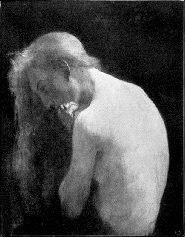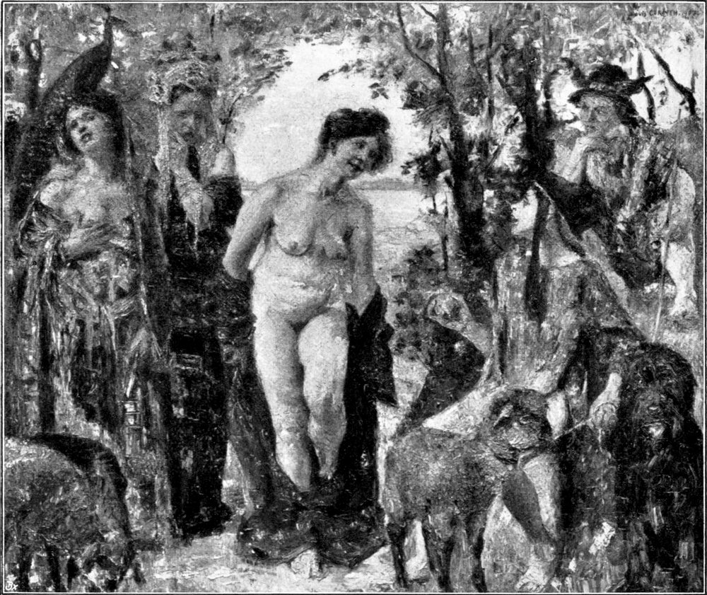 In dem lustigen „Bacchanale“ vom Jahre 1896 dagegen, das einstmals in München, für uns heute unbegreiflich, abgelehnt wurde, enthüllt sich das Dionysische heiterer Lebenskunst, mythologisch verklärt, in reinster Form (Abb. 26). Botticellische Frühlingsstimmung paart sich auf diesem Bilde mit dem tanzfrohen Rhythmus bewegter Gestalten. Derbe Sinnenfreudigkeit sucht einen Gleichklang in der blumensprießenden Landschaft. Ein dekorativer Zug beherrscht die Komposition, der später nur selten ähnlich begegnet. Diesem Werke nahe verwandt ist die auf eine ähnliche Note gestimmte „Geburt der Venus“, die vielleicht in noch höherem Maße die Erinnerung an den genannten Meister des ausgehenden Florentiner Quattrocento wachruft (Abb. 28). Vielleicht darf man in diesem Bilde auch entfernt Böcklinsche Reminiszenzen vermuten, obwohl man gerade dieses Meisters Einfluß sonst bei Corinth am wenigsten feststellen kann; das Verlangen nach dekorativer Wirkung ist auch hier unverkennbar.