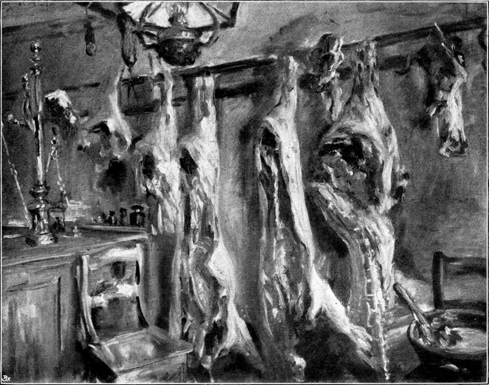 Aber er machte sich wenig daraus, da sein Innerstes voller Ideen steckte. Und obwohl er all seinen Kameraden an Können weit überlegen war, nahm er doch den Akademiebetrieb nicht sonderlich ernst. Gern verbrachte er seine Zeit bei einem seiner Verwandten, einem Fleischermeister, der ihn oft mit ins Schlachthaus nahm, wo der angehende Künstler trotz dem Unwillen der hier beschäftigten Leute gern malte. Ist auch aus dieser frühen Zeit von solchen Bildern nichts erhalten, so wird man doch diese Eindrücke nicht gering veranschlagen, da Corinth[S. 31] später oftmals und gern die Fleischerläden gemalt hat, die ihn malerisch ebenso lockten wie Rembrandt oder Ostade die Erscheinung eines aufgespannten toten Ochsen. Ja, man kann sogar weiter gehen und behaupten, daß in der Art, wie Corinth schon in diesen akademischen Lehrjahren unbewußt das Leben überall an seinen ursprünglichen Punkten aufsucht, vorgreifend ein Teil seiner späteren künstlerischen Entwicklung angedeutet ist.
