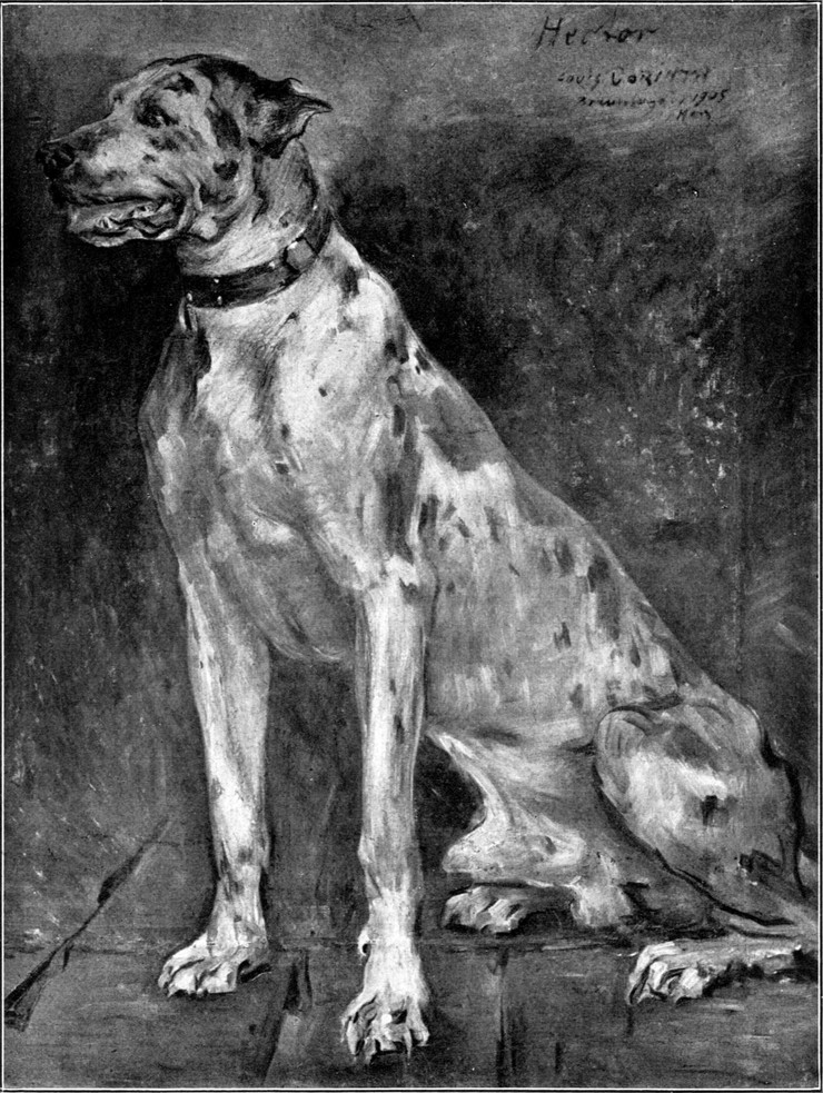 Ein weiteres Selbstbildnis des Meisters, auf dem er sich als „grölender Bacchant“ karikiert hat, mag den Auftakt geben. Es ist für sich wiederum ein Beweis von jener dionysischen Lebenslust, die in Augenblicken das Schaffen Corinths verklärt hat und für die wir ohne Mühe in den Werken alter Meister Gleichnisse finden. So denkt man vor diesem Bilde an Brouwer, an den Simson, der an seinen Ketten rüttelt, so wie ihn Jan Steen geschildert hat, und an vieles andere, was mit Worten einfach nicht zu erschöpfen ist. Mag das Gemälde auch für sich einer noch so übermütigen Laune des Augenblicks entsprungen sein, malerisch ist es eine Leistung von unvergleichlich hohem Range. Wie hier die derbe Grimasse mit wenigen kräftigen Pinselstrichen festgehalten, wie alles nur skizzenhaft und doch von einer ursprünglichen Wucht des künstlerischen Temperamentes umrissen ist, das gibt dieser kleinen Probe malerischen Könnens seinen einzig dastehenden Wert (Abb. 62). In der Technik nähert sich gerade dieses Bild schon ganz den Spätwerken eines Hals. Denn jeder Pinselstrich ist mit dem Spachtel hingemeißelt. Wie das Weinlaub im Haar nur mit zwei, drei vom Lichte gehöhten Farbflecken angedeutet ist, so sind auch die Furchen des Antlitzes beinahe plastisch aus der Farbe herausmodelliert worden. — Technisch steht dem Bilde das prächtige Porträt eines Hundes nahe, das Corinth für einen Wiener Bekannten gemalt hat und das als Stück bravouröser Malerei einen hohen Rang beanspruchen darf (Abb. 70). Trübner hat ähnlich einmal eine Dogge gemalt, aber an Verve ist er doch mit seinem Hunde hinter dieser Corinthschen Bestie zurückgeblieben. Derartige Schöpfungen wollen im Sinne dieser biographischen Darstellung weniger neue Belege für das längst begründete Können unseres Künstlers, als vielmehr Beispiele seiner umfassenden malerischen Begabung vermitteln, während andere Werke aus dieser Zeit sicher unmittelbarer den Blick zur Werkstatt des Künstlers hinlenken und seiner Sinnesart einen weitaus besseren Ausdruck gewähren. Als ein solches Bild sei an dieser Stelle die „Kindheit des Zeus“ notiert, die dem „Kampf des Odysseus“ sehr nahe steht und doch im Sinne der Komposition von jenem wiederum stark verschieden ist (Abb. 71). Nicht nur, weil eine größere Freiheit der Bewegung diese durchweg gleichmäßig behandelten Gestalten beherrscht, sondern weil auch die Landschaft hier bei der Komposition wesentlich mitspricht und das Burlesk-Dionysische kräftig unterstreicht. Das ist ein echtes Stück mythologischen Lebens, so wie es die Kunstanschauung eines reinen Naturvolkes erfunden und gestaltet hat, und es ist wichtig, auch an dieser Stelle wiederum zu betonen, daß der kräftige Realismus solcher und ähnlicher Szenen besser jene ursprüngliche Note trifft als alles, was die Kunst vor solchen Motiven mit dem Kulturgehalt unserer Zeit und einem fein abgewogenen, aber doch wohl meist unechten Sentiment erfüllt hat. Vielleicht erkennt man den Menschen Corinth[S. 84] nirgends besser als auf derartigen Schöpfungen, wo seiner Phantasie keine Grenzen gezogen sind, aber seiner ursprünglichen und stammesechten Art die schönsten Möglichkeiten zum künstlerischen Ausleben dargeboten werden. Im übrigen braucht man an die malerischen Vorzüge, an die zeichnerische Pracht eines solchen Bildes kaum noch besonders zu erinnern, weil der artistische Reiz mit völliger Selbstverständlichkeit vor unser Bewußtsein tritt.