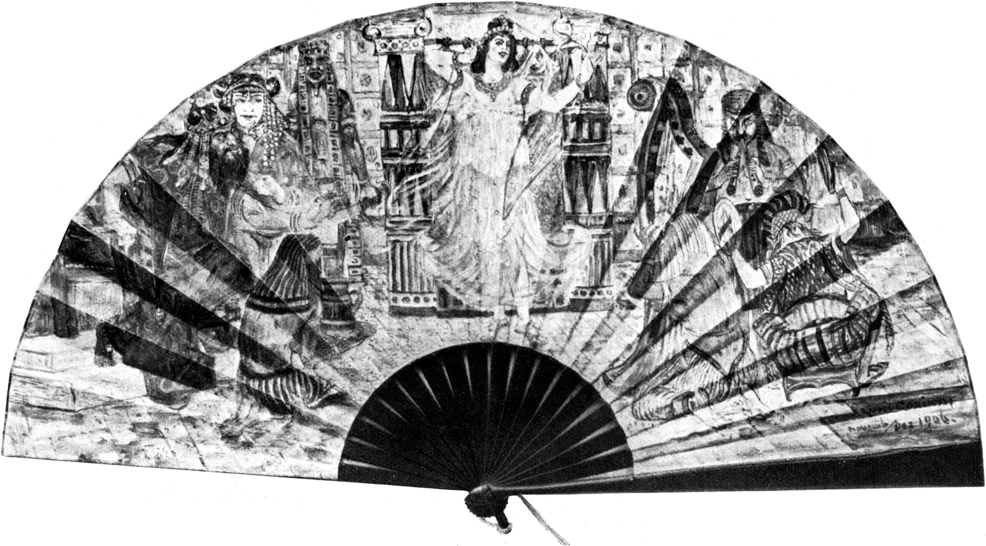 Leider ist die hier abgebildete, nicht ohne einen Stich ins Burleske gegebene Komposition „Venus und Mars“ in diesem ursprünglichen Zustand nicht mehr erhalten, da der fettleibige, vielleicht doch gar zu unhellenisch wiedergegebene Kriegsgott später der Zerstörungswut des Künstlers zum Opfer gefallen ist (Abb. 72). — Dagegen ist der hier abgebildete Fächer, den Corinth für Frau Mauthner in Berlin gemalt hat, als Beweis für das gelegentlich von ihm versuchte Übergreifen auf rein dekorativ kunstgewerbliche Gebiete (dem auch seine seltenen Theaterentwürfe für Reinhardt beizurechnen sind) (Abb. 55) gewiß nicht ohne Interesse, obwohl gerade die hier gegebene Darstellung der tanzenden Salome in ihrer starken Anlehnung an archaistische Vorbilder viel unpersönlicher anspricht als alle zuletzt behandelten Arbeiten (Abb. 76). Auf einem Selbstporträt des nächstfolgenden Jahres (1907) erscheint Corinth mit entblößtem Oberkörper, das Glas Wasser in der Hand, auf dem Haupte ein lang herunterhängendes Tuch gewissermaßen als „ouvrier par excellence“. Und doch webt gerade in diesem Antlitz ein nachdenklicher Ernst, eine verhaltene Energie, die der etwas derben Physiognomie eine Art höherer Vergeistigung verleiht (Abb. 75). Ist es vielleicht auch nicht das sympathischste unter seinen zahlreichen Selbstbildnissen, so sicherlich doch eines des besten, was malerische Verve und starke Charakteristik anlangt. Technisch spielt auf diesem Bilde der Spachtel eine Hauptrolle, der noch stärker auf einem anderen Werke des gleichen Jahres, dem in der Dresdner Sammlung Rothermundt befindlichen „Urteil des Paris“ in die Erscheinung tritt (Abb. 80). Setzt das Bild im Thema die Reihe der schon[S. 87] bekannten, der homerischen Götterwelt entnommenen Szenen fort, so steht es eben in der technischen Behandlung sehr im Gegensatz zu allen früher erwähnten Werken dieser Art; denn es ist kräftiger in der Betonung der farbigen Valeurs und dabei im ganzen doch auf eine seltsam transzendentale Note gestimmt, so daß man fast den Eindruck bekommt, als spiele sich diese entzückend naive Szene hinter einem ganz feinen, kaum fühlbaren Nebelschleier ab. Dadurch wird die Illusion bedeutend erhöht, und das Wirklichkeitsmoment zugunsten einer gewollten Verklärung merklich zurückgedrängt. Das Bild atmet in jeder Beziehung eine fast arkadische Heiterkeit. Die Freiheit der Komposition, die durch den schönen Akt der Liebesgöttin in sich zusammengehalten wird, berührt ebenso wohltuend wie das Gegenüber der beteiligten Gruppen, links der Göttinnen, rechts des Paris mit seinen Schafen und des im Hintergrunde harrenden und doch der Szene nicht sehr diskret beiwohnenden olympischen Sendboten. Besonders fein ist auch der Ausblick auf das Meer gegeben, das hinter der göttlichen Venus sichtbar wird wie ein feiner Hinweis auf die Geburt der Anadyomene. In sich[S. 88] aber ist die Gruppe durch die Handlung zu einer köstlichen Konzentration gekommen. Wie die beiden Göttinnen neiderfüllt der nackten Aphrodite zuschauen, wie Paris halb noch zögernd den Apfel wägt und doch bereits durch das Versprechen der Verführerin gelockt wird, das ist alles sehr fein und diskret, aber auch mit einer meisterhaften Überlegenheit angedeutet.