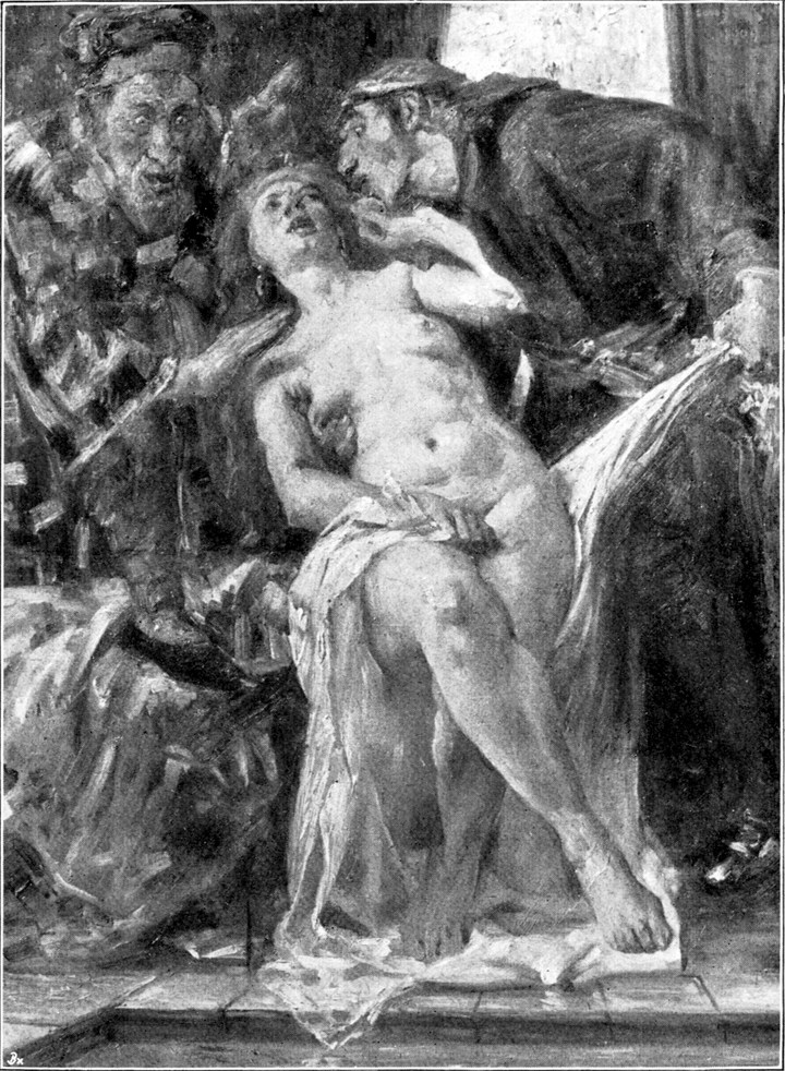 In dem Jahre 1902, in dem Corinth das Porträt des Peter Hille gemalt hat, begegnet uns zum erstenmal in seinem Schaffen jene Frau, die die Gefährtin seines Lebens, die Mutter seiner beiden prächtigen Kinder geworden ist, Charlotte Berend, die er als Schülerin kennengelernt und die sich inzwischen zu einer Künstlerin von ausgesprochener Eigenart entwickelt hat. Das erste Bildnis zeigt sie als Braut des Meisters mit dem Blütenzweig in der Hand, koloristisch[S. 73] sehr fein abgewogen, stehend vor grauem Hintergrund mit seitwärts gewandtem Kopf, der ein kräftig markiertes Profil erkennen läßt (Abb. 48). Wenn Corinth sich auf der Signatur noch als „der Herr Lehrer“ bezeichnet, so weist das humorvoll auf jenen rein äußerlichen Zufall, der den Hagestolzen spät der Ehe zugeführt hat. Ein etwas später, aber noch im gleichen Jahre entstandenes zweites Bildnis, das in jeder Beziehung ungleich intimer und persönlicher anspricht, zeigt die junge Gattin sitzend im Lehnstuhl, vollgetroffen von dem von außen durch das Fenster hereinbrechenden Tageslicht (Abb. 49). Wie hier das Antlitz in stille Beschaulichkeit versunken ist und das Licht die Fleischpartien modelliert und wie man die Empfindung hat, daß hier das Bewußtsein jungen Glückes dem Künstler bei seiner Arbeit helfend zur Seite gestanden, das gibt gerade diesem weiblichen Porträtstück einen unvergleichlichen Reiz und hebt es turmhoch über alle ähnlichen Frauenbildnisse, die Corinth im Auftrag irgendwelcher Besteller gemalt hat. Ein Denkmal dieser neuen beruhigten Stimmung, die das Schaffen des Künstlers in jenem Augenblick häuslichen Glückes überkommt, ist auch das dritte Bild, auf dem er sich ein Jahr später mit der Gattin im Arm selbstporträtiert hat, das von fern an das üppige Doppelbildnis Rembrandts mit Saskia in Dresden erinnert (Abb. 50). Vor einem Tisch mit Früchten und Wein sitzt der Künstler, das gefüllte Glas dem Beschauer darbringend. Frohe Sinnlichkeit atmet in diesem Werke, und auch die Farbe, das halb Visionäre des Bildes unterstreicht bewußt, aber auch mildernd, die auf Lebensbejahung und Daseinsfreude eingestellte Note der Szene, die man im Rahmen des Biographischen besonders gern willkommen heißt. — Das hier abgebildete Gemälde unter dem Titel „Fluch auf Saul“, das noch im Jahre 1902 entstand, existiert heute nur noch in einem Bruchstück. So köstlich die Erscheinung des Alten festgehalten ist, so wenig glücklich und gelöst spricht die Komposition an, und diese Erkenntnis wird auch den Meister veranlaßt haben, sein Bild später zu zerstören (Abb. 52). Dagegen zählt das unter dem Eindruck einer Aufführung von Oskar Wildes „Salome“ entstandene Porträt der Frau Eysoldt unbedingt zu den stärksten Leistungen auf dem Gebiet weiblicher Bildnismalerei, die Corinth gelungen sind. Die tierisch perverse Art dieser Salome ist ausgezeichnet getroffen, der skizzenhafte Schmiß täuscht bewußt über die abstoßenden Details der Szene hinweg, aber im ganzen wird man gerade diesem Bilde das Lob psychologischen Durchdringens im Motiv nicht vorenthalten können (Abb. 51). Koloristisch ist das Stück ganz auf einen kalten grau-weißen Ton gestimmt, von dem sich hier und dort die malerisch kräftig nuancierten Valeurs abheben. Vorgreifend mag gegenüber dieser Schöpfung weiter angedeutet sein, daß das literarische Schaffen der Zeit Corinth in der Folge mehr als einmal befruchtet hat; man denke nur an den später zu wertenden prachtvollen Florian Geyer, an das Bildnis der Frau Tilla Durieux und anderes mehr. Ja, ist nicht im Letzten die Vorstellungswelt gerade des bildenden Künstlers oft dem Theatralischen überhaupt verwandt! Von Rembrandt wissen wir, wie ganz bestimmte Szenen seiner Bilder und Radierungen den Eindrücken des Theaters seiner Zeit entsprungen sind, wie ihm der Bühneneindruck mit seinen festbestimmten Kulissendistanzen oft den Rahmen seiner Kompositionen gegeben hat, wie die visionäre Kraft seines Goldlichtes an dem durch die Bühnenbeleuchtung hervorgerufenen Widerspiel von Licht und Schatten entzündet[S. 74] wurde. Und auch in Corinths Schaffen wirkt eine so drastisch derbe Szene wie der hier farbig abgebildete „Kampf des Odysseus mit dem Bettler“, ebenfalls vom Jahre 1903, wie die Darstellung einer vor Zuschauern gegebenen Burleske. Denn hier ist alles auf den Betrachter hin orientiert, der Ansprung des „göttlichen Dulders“, der mit derber Faust seinem Gegner ins Antlitz greift, der Chorus der applaudierenden Männer und Weiber und das Geschlossene dieser Komposition überhaupt (Abb. 54). Hier begegnet der Meister uns aber auch so ursprünglich in seinem Temperament wie auf nur wenigen Schöpfungen dieser Jahre. Der Humor dieser Szene ist wirklich drollig, und wenn wir ehrlich sind, müssen wir auch gestehen, daß Corinth seinen Homer im Grunde viel besser verstanden hat, als jene oft klassisch verbildeten Philologen, die uns in unserer Jugend vor allem Derben und moralisch irgendwie Verletzenden behutsam durch Überspringen einiger Verse zu schützen suchten. So skizzenhaft übrigens das Bild — ausgenommen die Hauptgruppe — angelegt ist, so fein abgewogen ist es gerade in seinen koloristischen Werten. Dies warme Ziegelrot, das mit dem kühlen Silbergrau hier und dort kontrastiert, hebt sich aus der bräunlichen Gesamtharmonie fein heraus, so daß wir malerisch das Werk unbedenklich als eine der besten Leistungen bezeichnen dürfen. Von geradezu fabelhafter suggestiver Gewalt ist die Gruppe der Streitenden. Diese Akte sind in ihrer Bewegung meisterhaft erfaßt und bis[S. 75] ins letzte durchmodelliert. Hier spricht eine Könnerschaft, die immer exzeptionell bleibt und zeichnerische Schwierigkeiten überhaupt nicht mehr kennt. Dieses Bild aber steht als Mittelglied zwischen dem in München gemalten „Diogenes“ und allen nachfolgenden, von der griechischen Mythologie angeregten Szenen, die nicht immer ähnlich ursprünglich gesehen, meistens aber do