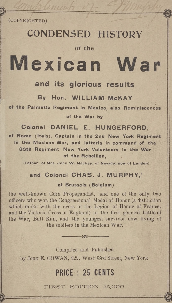 It occurred to the compiler of this pamphlet that it would not be out of place to mention the name of Colonel Murphy’s son, Ignatius, a well-known journalist and editorial writer, who wrote the life of Colonel Hungerford (a book of nearly 400 pages). This gallant soldier recently died in Rome, Italy, at the home of his daughter, the Countess Telfener, at the Villa Ada, attaining the ripe age of seventy-five years. He passed peacefully away, surrounded by his affectionate wife, his daughter, the Countess, and his numerous grandchildren.