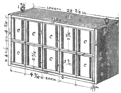 [13] I have exercised great care, and incurred considerable expense, in giving drawings with measurements and directions for constructing Controllable Hives, glass boxes, etc., that such of my readers as wish may be able to construct the hives and manage bees according to the new system as taught in this work. I have no time or desire to establish a business in the manufacture of hives, but if any of my readers want a full sized Controllable Hive, ready for a swarm of bees, the better to enable them to make the Controllable Hive, I will furnish them. Price eight dollars. In no case will I furnish more than one to the same address. The hive is not patent, so any one can manufacture and use as many as they wish. They can make them at their home, especially in the winter season, much cheaper than I can furnish them.