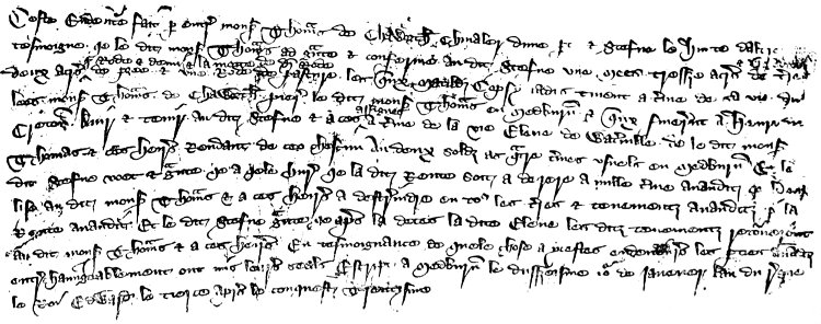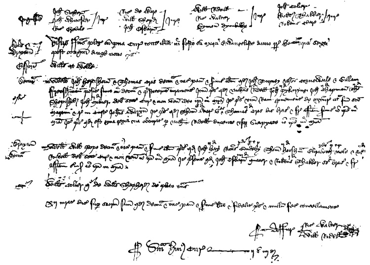It has been said that a knowledge of Latin is indispensable to the would-be transcriber of old deeds; this is not really the case for ordinary antiquarian research, for the meaning can be discovered easily with only very slight knowledge. Legal Latin consists so entirely of set forms that when once these forms are familiar to the reader, they are without any difficulty recognised, and[9] are so little liable to any variations that they are easily rendered into English. The most important points being a correct and accurate attention to the names of people and places, with the descriptions of the localities referred to. As the use of Latin for legal transactions almost entirely superseded the Norman-French language after the reign of Edward III. (although it is an open question whether deeds were not duplicated into the two languages), very few old deeds are met with in the latter language, and those few are usually so well written and legible that they can easily be understood with the help of a slight knowledge of modern French.