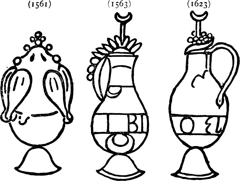 There were always two divisions of handwriting: the formal hand, employed for clerk’s work, and a freer, less mechanical, less careful style, used for private correspondence. Writing was a profession, and, as late as the sixteenth century, when it was necessary to communicate with persons at a distance, a professional scribe was employed to write the letter. Even now in slums may be seen the notice of ‘Letters written here,’ though this chiefly refers to it being a shop address to which letters may be directed. But letter-writing was rare, and did not become general till after the sixteenth century; even then it was restricted to the upper classes of society. I have in Chapter IV. given a brief account of the paper used in England. Letter or post paper was made of a square uniform sheet, folded; it was known as ‘Pot paper,’ from its water-mark. This varied slightly, the jug or water-pot being much more[136] elaborate in some examples. It came principally from abroad, either the Low Countries or Germany; each separate factory very likely adopted a distinct shape; the makers’ initials are to be found upon the band across the pot, but are difficult to read, nor so far as I know is anything known about the manufacturers or their names.