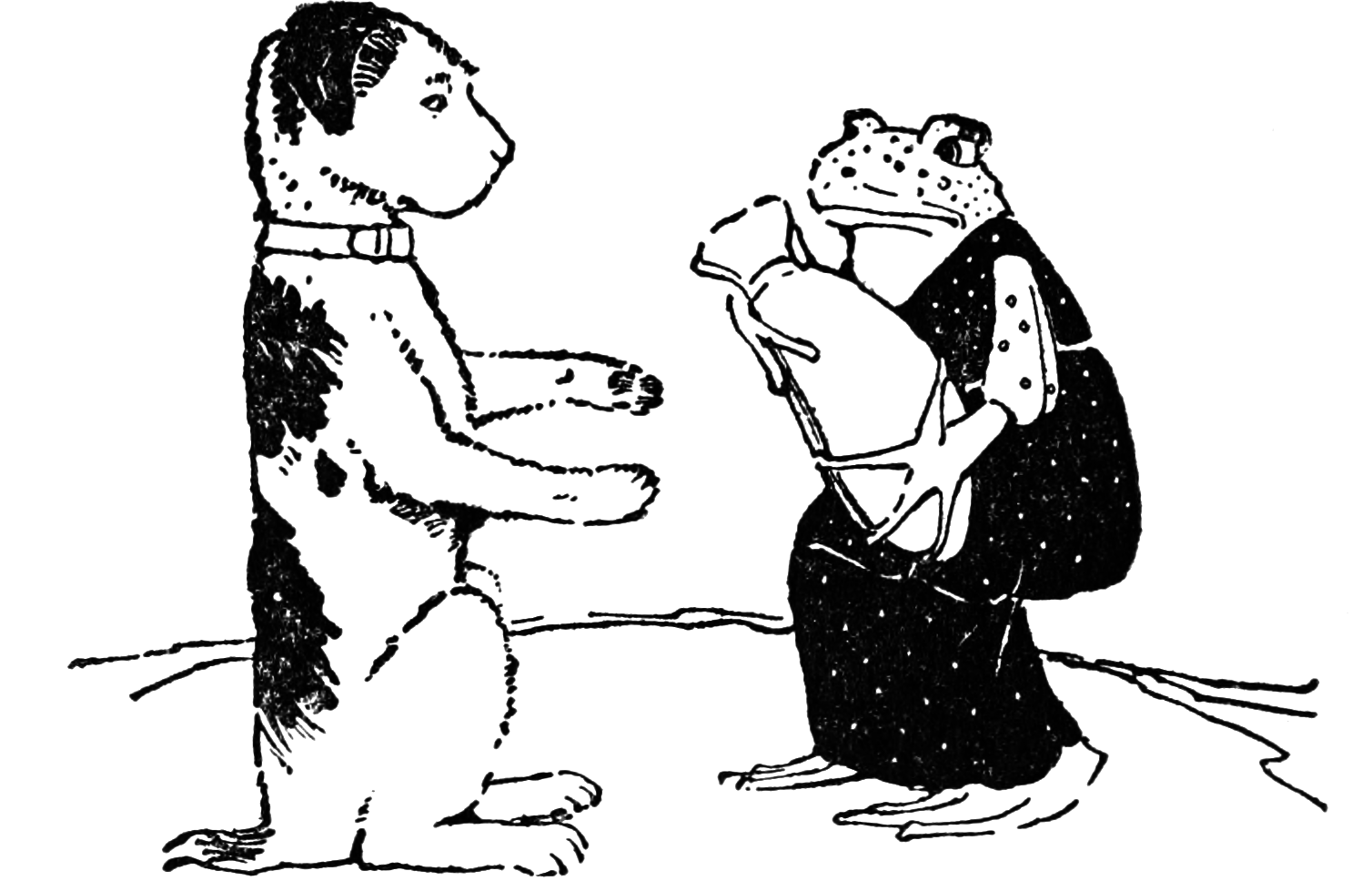 Suddenly there was a rustle in the bushes, and an enormous black dog appeared. He was not a pleasant dog to look at or talk to. Any dog of good standing could feel that at once.