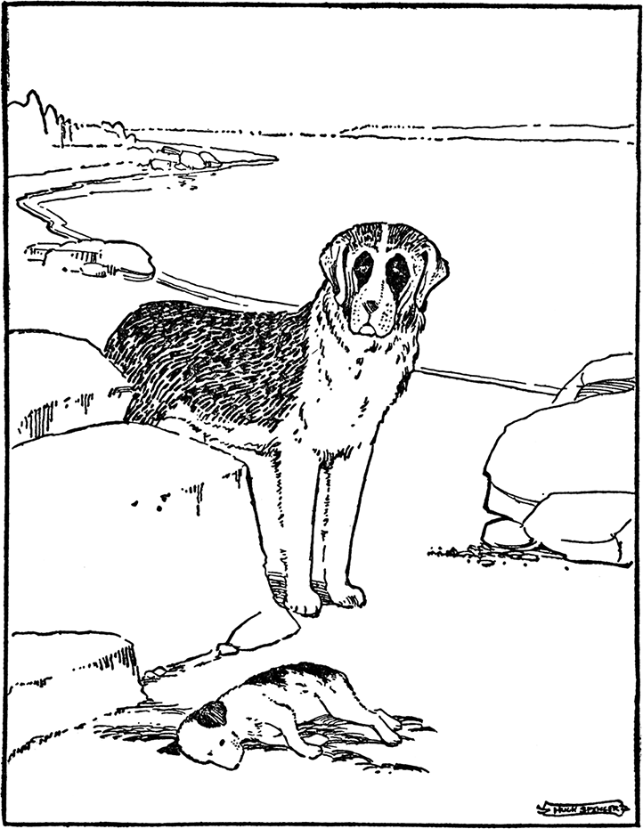 At this Ready gave up and moaned out his story. Shaggy Dog’s eyes grew kinder and kinder. In a moment he had looked at the[Pg 110] poor leg and had made it much more comfortable by a little licking. Then he had Ready bathe it in a pool near by, and gave him the best medicine in the world. Do you know what it was? He gave him back his courage.
