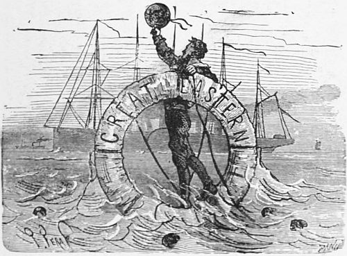 At Prince’s Landing-Stage, a small tug in the service of the “Great Eastern” was getting up steam. I went on board and found it already crowded with workmen and mechanics. As the clock in Victoria Tower struck seven, the tender left her moorings and quickly ascended the Mersey with the rising tide.