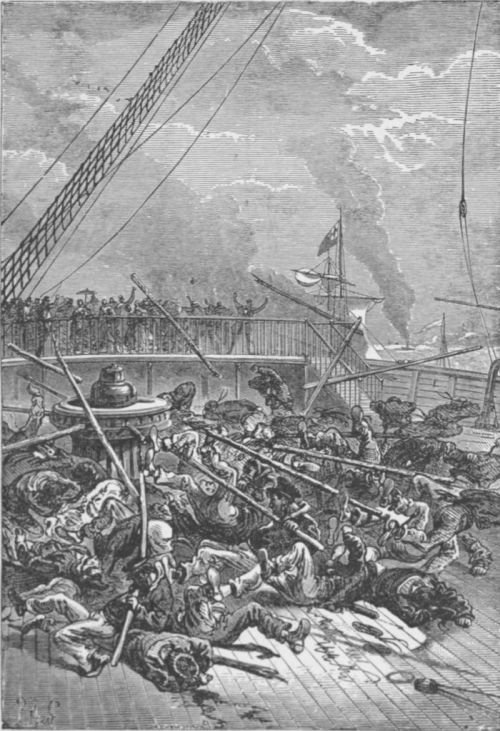 Then was a moment of anxiety impossible to describe, every one was silent, and each watched fearfully the arch described by the projectile. Nothing could be done to escape it, and in a few seconds it fell with a frightful noise on the fore-deck of the “Dolphin.”
