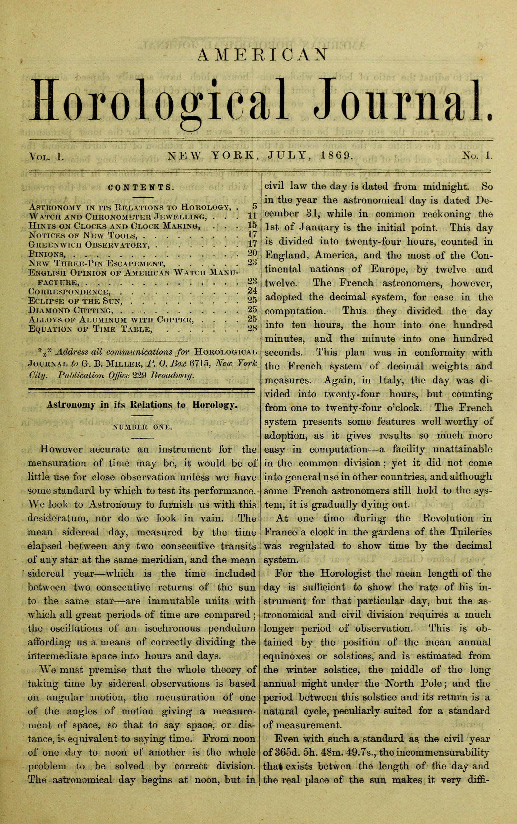 ⁂ Address all communications for Horological Journal to G. B. Miller, P. O. Box 6715, New York City. Publication Office 229 Broadway.