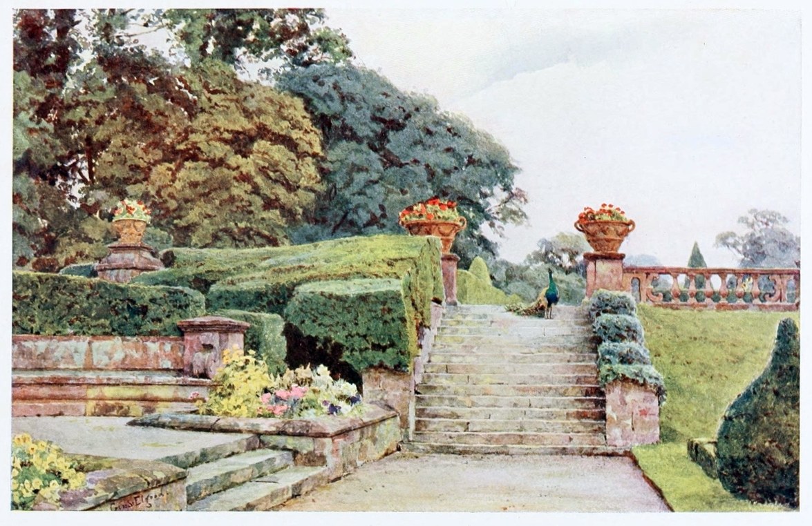 The iron-railed steps in the picture come down upon a grassy space rather near its end. Behind the spectator it stretches away for quite four times the length seen in the picture. It is bounded on the side opposite the steps by a long rectangular fish-pond. The whole length of this is not seen, for the grass walk narrows and passes between old yew hedges, one on the side of the pond, the other backed by some other trees against the kitchen garden wall, which is a prolongation of the terrace wall in the picture.