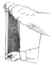 In the fall and at all times when honey is not coming in freely, caging the queen for a few hours or days is desirable. A cage which permits the queen to remain directly on the comb itself is infinitely superior to- 94 - any other. Fig. 66 shows a pipe-cover cage as made by the author, the size of which may be greater if circumstances require—that is, when it seems advisable, with a queen of great value, to include under the cage a number of cells containing emerging brood. Ordinarily the size here shown will suffice. The queen is caged before a closed window on a comb of honey with five or six recently emerged bees taken from the hive to which she is to be introduced. The comb holding the caged queen is to be placed in the center of the queenless colony, where the bees will cluster on it, yet with the end of the cage pressed firmly against the adjoining comb, so that the cage will remain in place even though a heavy cluster should gather on it. On the following day, just before dark, the queen should be released, provided that upon opening the hive the workers are not packed densely about the cage trying to sting her through it. In the latter case she should be left twenty-four or even forty-eight hours longer, and in the autumn it is generally advisable to keep her caged several days or even a whole week. If left longer than one day all queen cells should be hunted out and destroyed a few hours before releasing the queen. Feeding while the queen is caged is a good plan if gathering is not going on briskly. Upon freeing the queen, diluted honey drizzled down between the combs will serve to put the bees in a good humor for the reception of the new mother bee. The entrance of the hive should be contracted for a short time so that but a few bees can pass in or out at a time.