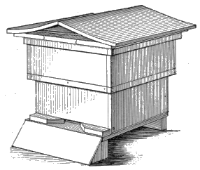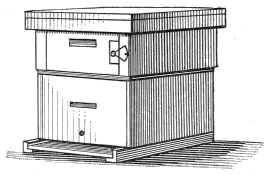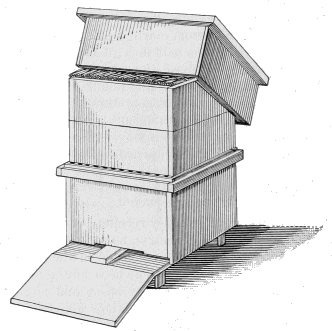 Arranging frames with starters or combs merely begun between the brood nest and the flight hole of the hive while the bees are given storing space above or back of the brood-nest (figs. 68 and 69) La a plan strongly recommended by Mr. Samuel Simmins, of England, and which has come to be known as "the Simmins non-swarming method," some features of it and the combination into a well defined method having been original with him. It is an excellent preventive measure, though not invariably successful even when the distinctive features brought forward prominently by Mr. Simmins—empty space between the brood combs and entrance, together with the employment of drawn combs in the supers—are supplemented by other measures already mentioned; but when, in addition to the space between the brood and the flight hole, the precaution be taken to get supers on in time, to ventilate the hive well, and to keep queens not over two years old, swarming will be very limited. If to these precautions be added that of substituting for the old queens young ones of the current season's raising, before swarming has begun, practical immunity from swarming is generally insured.