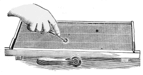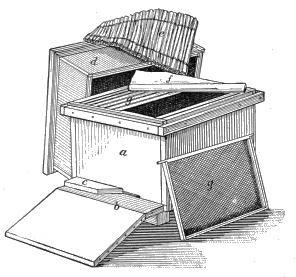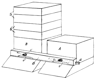 The manner of using the device is simple. Before the colonies swarm the device is attached to the fronts of two adjacent hives. The slide (fig. 70, sl) having been inserted at one end of the device, the bees returning from the fields are all run into the other hive, on which the supers are then placed. Before the colony, thus made doubly populous, decides to swarm, the slide and supers are both changed to the other hive. This is repeated every four or five days during the swarming period.