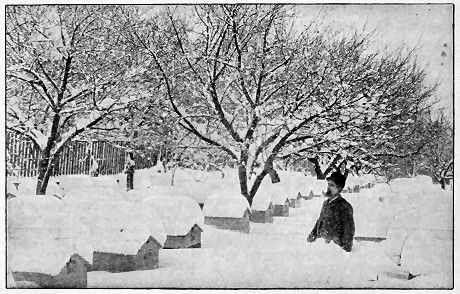 Dry cellars or special repositories are utilized in those portions of the country where the cold of winter is extreme and likely to be somewhat continuous. Economy of food is one of the chief advantages, but two-thirds as much, or about 20 to 25 pounds per hive, are needed to bring a colony through if conditions are favorable. The colonies, prepared as regards bees, queens, character of stores, etc., the same as for outdoor wintering, are carried into the cellar or repository just before the first snows come or severe freezing occurs. Caps are removed or lifted up and cushions or mats laid on the frames. Light is excluded and all other disturbing influences in so far as possible, the effort being made to keep the temperature at about 42° F. during the earlier part of the winter. Later, especially after brood-rearing may have been begun, a somewhat higher degree is admissible—45° to 46°, some even allowing it to go up to 50°. No definite rule can be given, however, since much depends upon the humidity of the air, etc. As long as the bees remain quiet the temperature is not too high and is preferably to be maintained. Should they become exceedingly restless, and the opportunity occur during a winter thaw to give them a cleansing flight, it will be advisable to return them for a few hours or a day or two to their summer stands, and when they have flown and quieted down, replace them in the cellar or repository. In the spring there should not be too great eagerness to get them out of the cellar, provided they are not restless. Their confinement indoors makes them somewhat sensitive to the outside cold, and due caution should be observed, else the ranks of the workers will become greatly decimated before young ones appear to take their places.