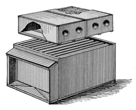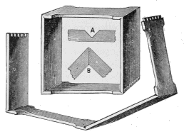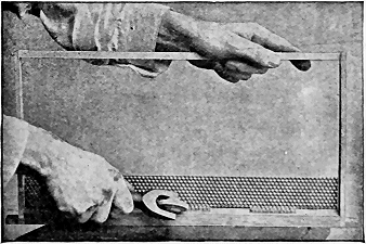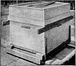 Extreme caution to prevent robbing is always advisable. A little carelessness or neglect in the apiary early in the spring or toward the latter part of the season may result in much loss. It is easier to prevent robbing than to check it at once or without loss after it is well under way. Leaving honey exposed about the apiary often induces robbers to begin their work; hence extracting and similar work must be done in bee-proof rooms whenever the bees are not gathering honey freely. It may at such times be necessary to do all manipulating early in the morning, before many of the bees have begun to fly, or later in the day, after they have ceased, or even under a tent made of mosquito netting and placed temporarily over the hive to be manipulated. Queenless and weak colonies should be put in order if possible before the honey - 117 - flow ceases. In any event the entrances of such hives should be contracted until but few or even no more than one bee can gain access to the interior at one time. Professor Cheshire has devised an excellent entrance block to prevent or check robbing. This is shown in fig. 70, and is so simple that anyone can make it. When contracted and placed at the hive entrance it will be seen that the robbers must make their way through a narrow and bent passage, something they are loath to attempt, especially if at the first onset they find the passage well guarded.