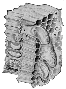 Ants and wasps.—Some of the larger ants and social wasps are very troublesome to the apiarist in tropical and even in subtropical regions. They seize the workers and cut them in pieces with their powerful jaws. Having once reduced the hive defenders, they even make bold to enter and carry off the queen as well as help themselves to honey. Trapping them with honey or with meat and killing them, as well as destroying the nests when found, are the only remedies. The paper nests are easily burned away, while an effectual remedy against ants is to open the hill and pour in an ounce or two of bisulphide of carbon.