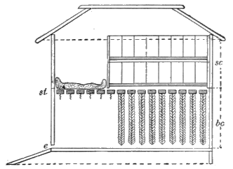 Bacillus gaytoni, also described by Professor Cheshire, is characterized by loss of hairy covering on the part of the workers and their crawling out of the hives over the ground, constantly wriggling their bodies until death occurs. It yields, according to Professor Cheshire, to the same remedies as Bacillus alvei, but having been less destructive and being far more likely to disappear without effort to cure it, less attention has been given to it. Lately, however, it has been alarmingly destructive in some of the extensive apiaries of California. Colorado, and Texas, so that some simple remedy would be very welcome.