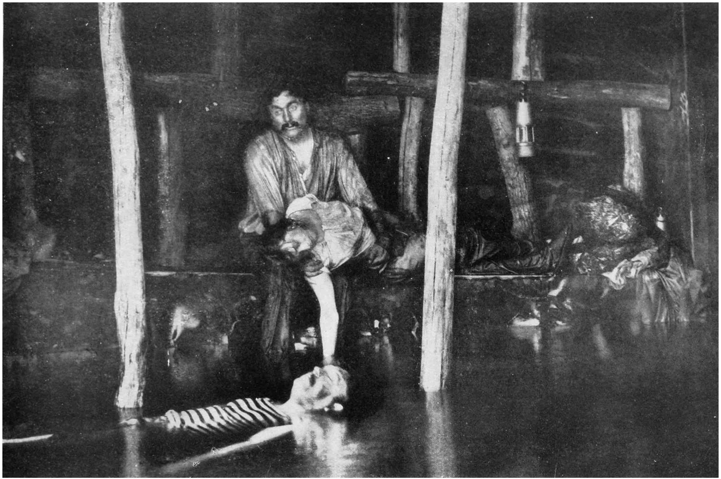 The producer giving instructions to the principal actor and his double, the legless cripple. The dummy legs in the foreground.—See page 211.