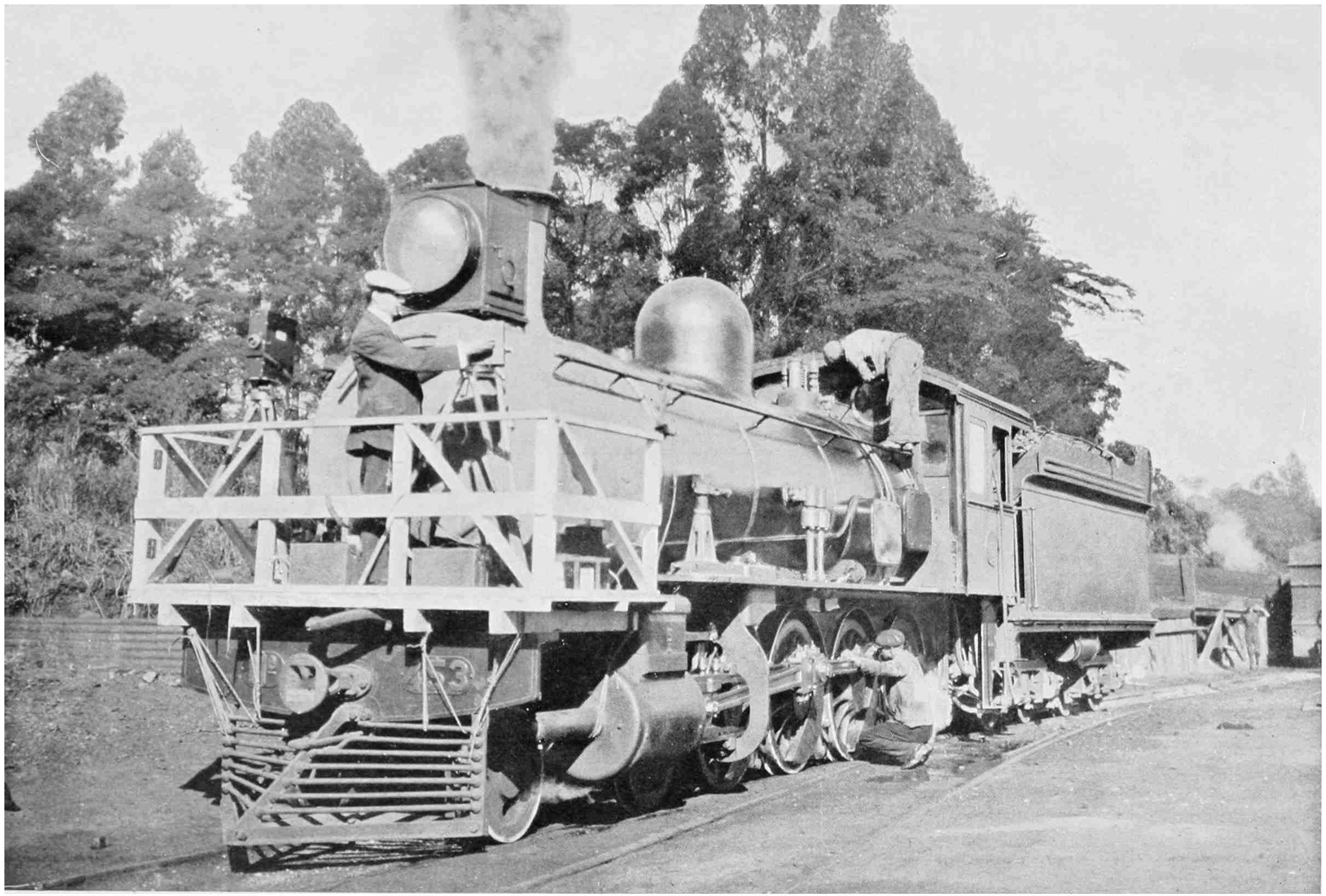 In order to secure scenes along the Cape to Cairo Railway a special platform was erected over the cow-catcher of a railway engine for the convenience of Mr. Butcher and his cameras.—See page 125.