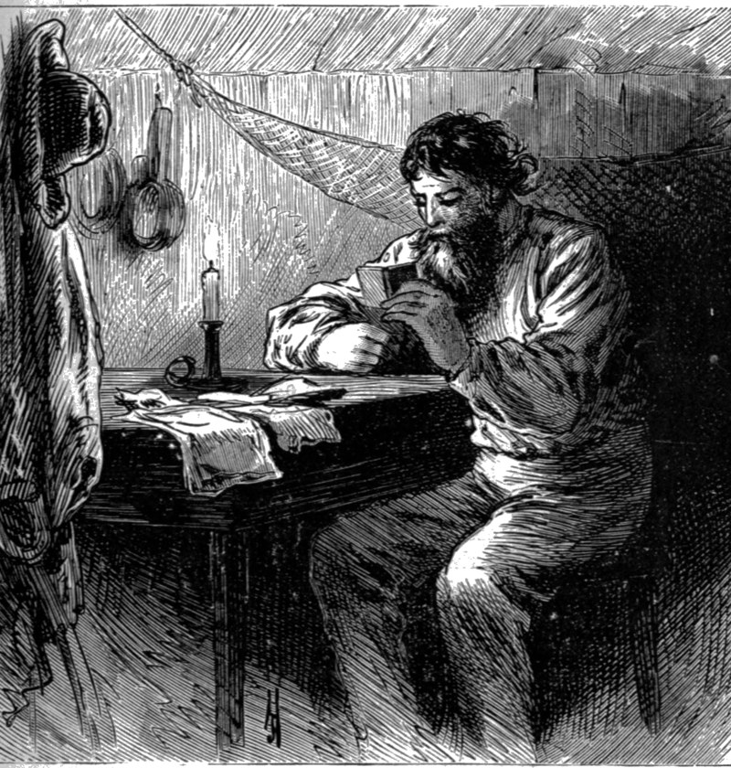 “Nobody knows me—nobody sez, ‘Hello!’—nobody axes me to name my bitters—nobody even cusses me. They let me stake a claim, but nobody offers to lend me a pick or a shovel, an’ nobody ever comes to the shanty to spend the evenin’, ’less it’s a greenhorn. Curse ’em all! I’ll make some of ’em bleed fur it. I’ll git their dust, an’ go back East; ther’s plenty of folks thar that’ll be glad to see me, ef I’ve got the dust. An’ mebbe ’twould comfort the old woman some, after all the trouble I’ve made her. Offer rewards fur me, do they? I’ll give ’em some reason to do it. I haint afeard of the hull State of Californy, an’——Good Lord! what’s that?”