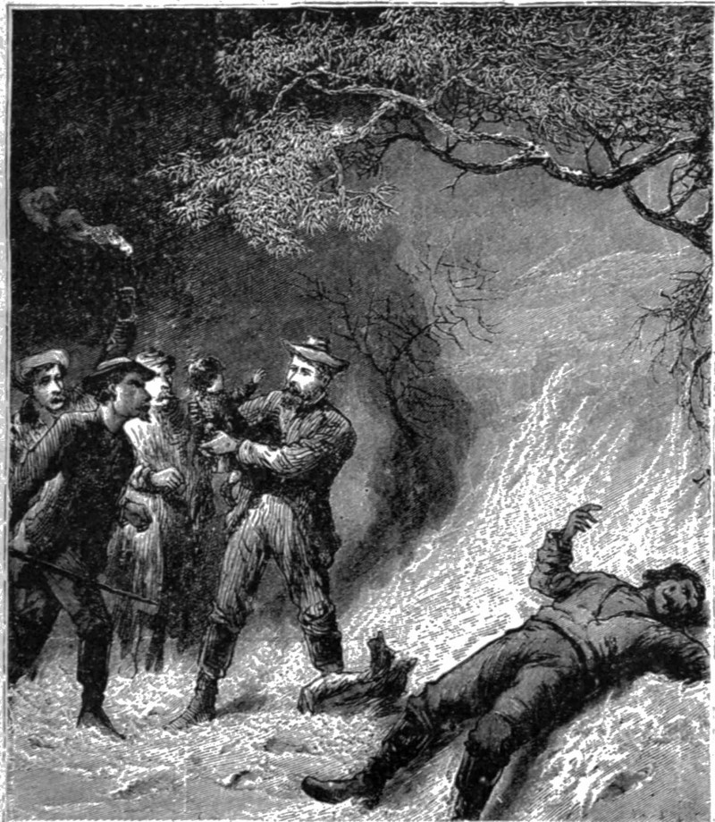 Strong man and expert swimmer as the ex-minister was, he was compelled to relinquish his hold of the wounded man; and Jude, after one or two fitful struggles against his fate, drifted lifeless down the stream and into eternity, while the widowed mother regained her child. The man of God, the chivalrous Frenchman and the brutish Mike slowly returned to their camp; but no one who met them could imagine, from their looks, that they were either of them anything better than fugitives from justice.