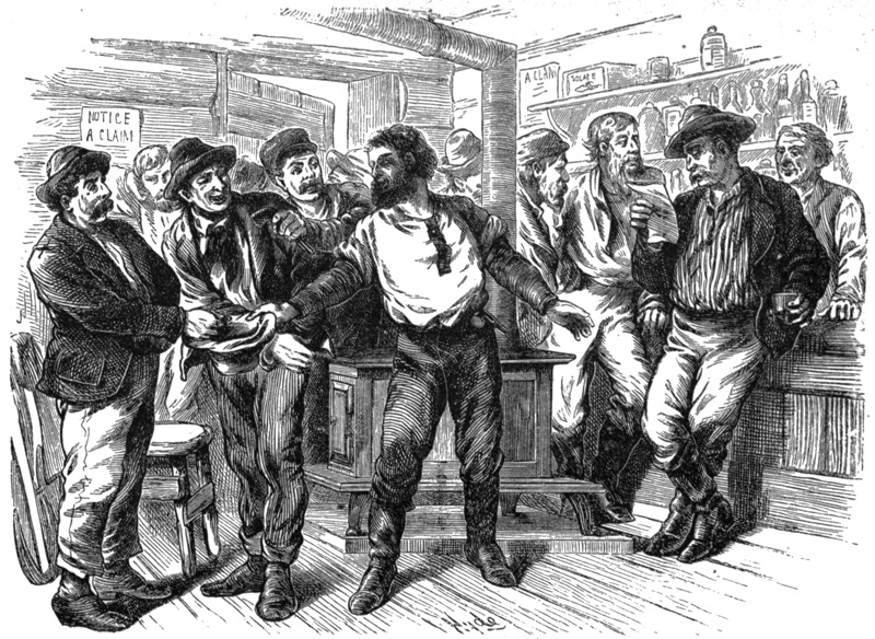 Soon the hopeful ones were reduced to half a dozen of these. Yankee Sam was the favorite among the betting men, for Sam, knowing the habits of New England damsels, went to Placerville one Friday, and returned next day with a horse and buggy. On Sunday he triumphantly drove Miss Brown to the nearest church. Ten to one was offered on Sam that Sunday afternoon, as the boys saw the demure and contented look on Miss Brown’s face as she returned from church. But Samuel followed in the sad footsteps of many another great man, for so industriously did he drink to his own success that he speedily developed into a bad case of delirium tremens.