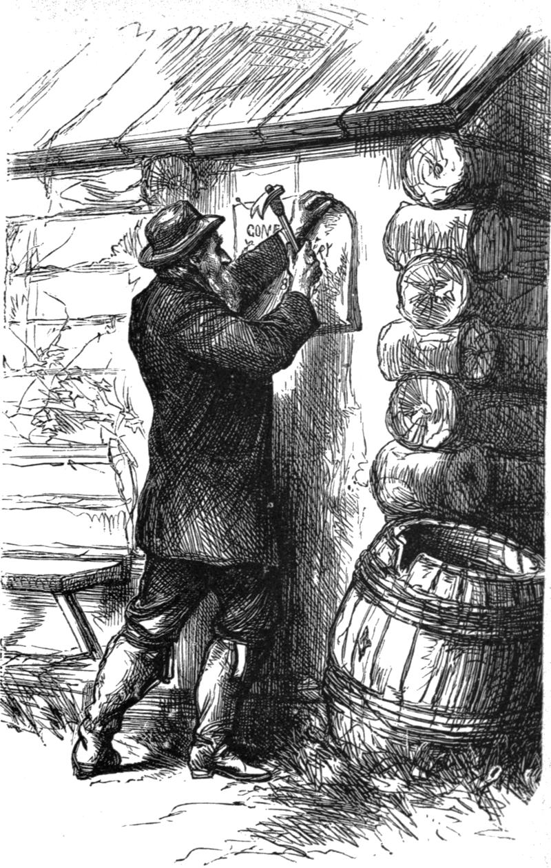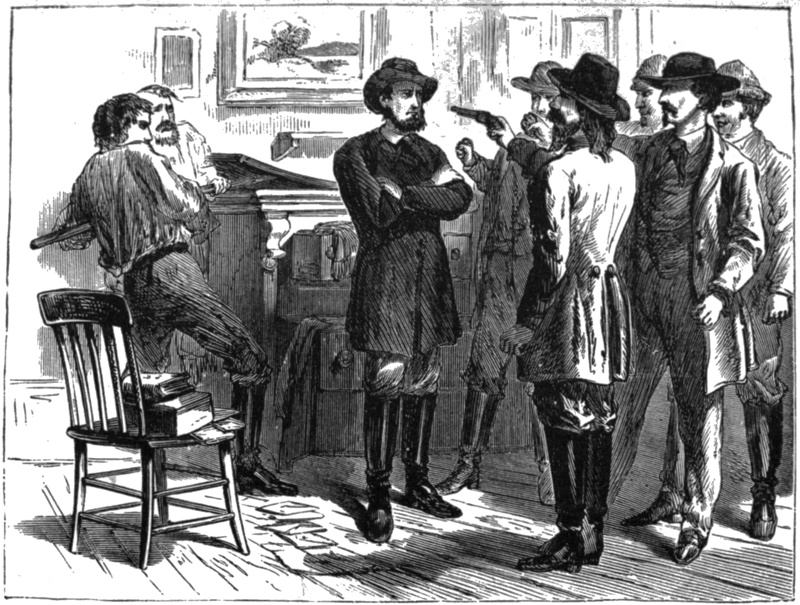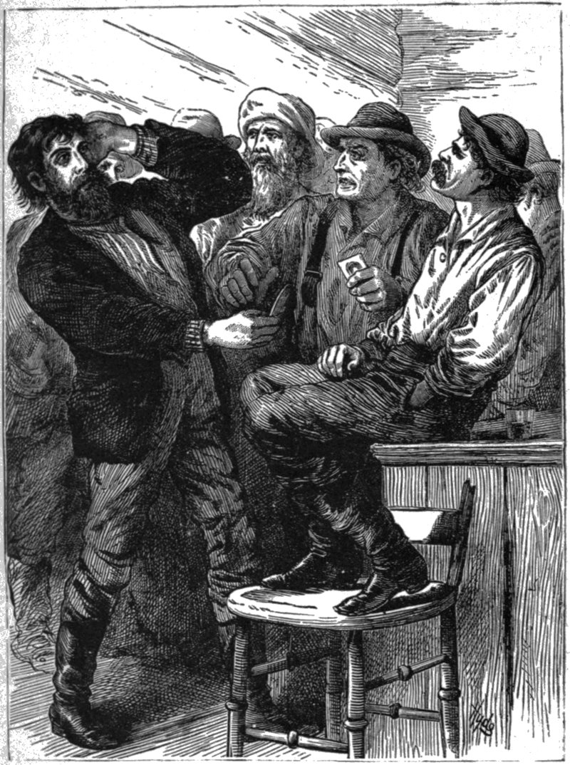 On the afternoon of the day on which the opening events of this story occurred, the boys, by agreement, stopped work two hours earlier than usual, for the stage usually reached Bottle Flat about two hours before sundown, and the one of that day was to bring the hated teacher. The boys had wellnigh given up the idea of further resistance, yet curiosity has a small place even in manly bosoms, and they could at least look hatred at the detested pedagogue. So about four o’clock they gathered at The Nugget so suddenly, that several fathers, who were calmly drinking inside, had barely time to escape through the back windows.