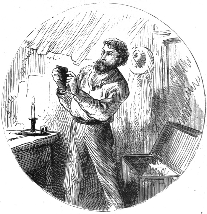 “Thar ’tis again!” he exclaimed, angrily. “Can’t be satisfied showin’ itself ev’rywhar, but must come out of my pocket without bein’ axed. Let’s see, p’r’aps it don’t mean me, after all—’One eye gone, broken nose, scar on right cheek, powder-marks on left, stumpy beard, sallow complexion, hangdog look.’ I’d give a thousand ef I had it to git the feller that writ that; an’ yit it means me, an’ no dodgin’. Lord, Lord! what ’ud the old woman say ef she wuz to see me nowadays?”