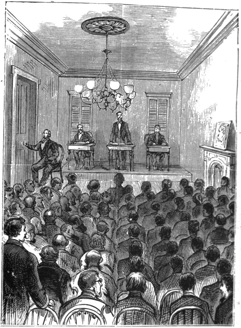 “Hurray!” “Bully!” “Good!” “Sound!” “Them’s the talk!” and other sympathetic expressions, were heard from the members of the late anti-school party.